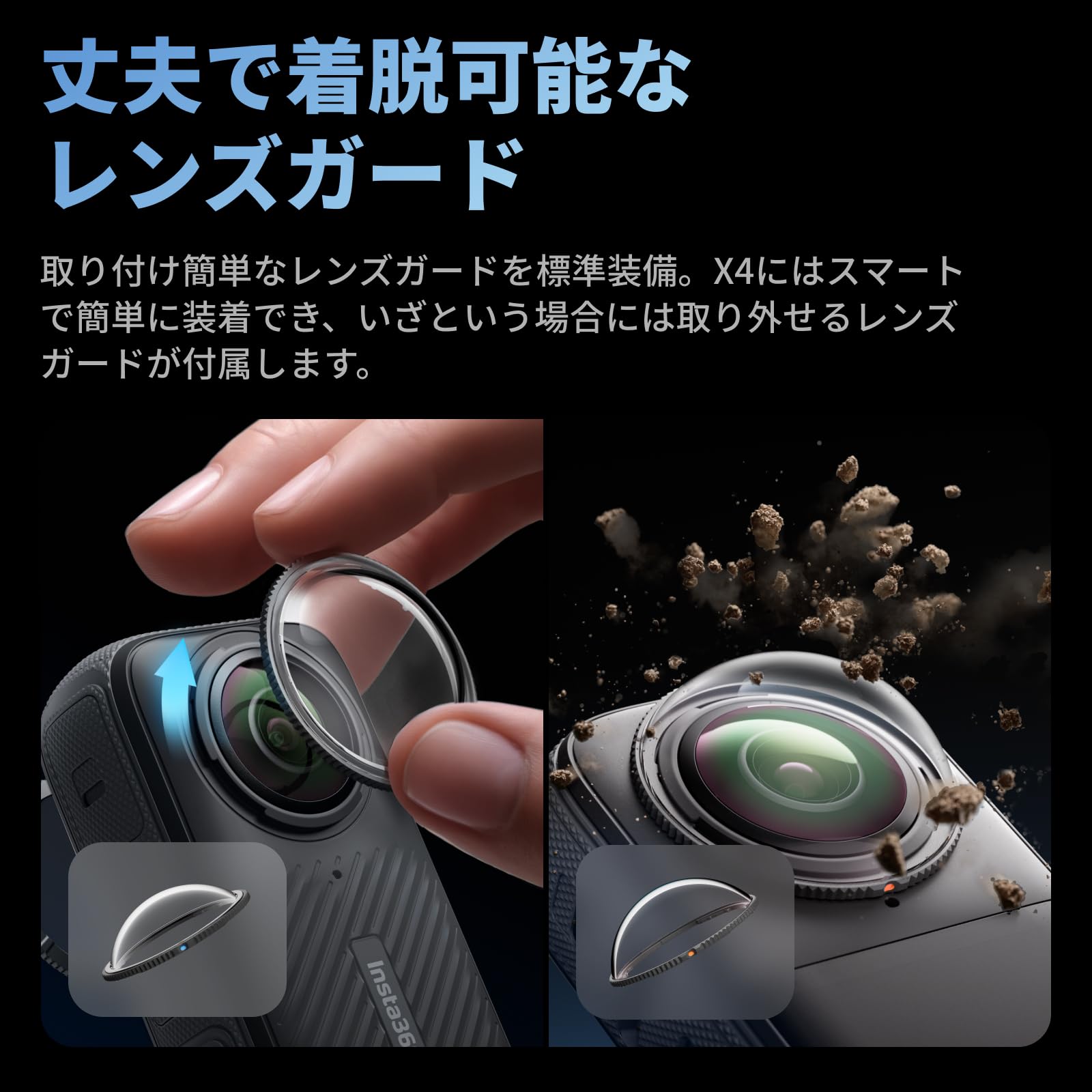 * スマートで頑丈な作り - X4はでこぼこ道にもプロ並みのハードにも耐えることができます。レンズガードもアップグレードし、どこでも簡単に脱着できます。