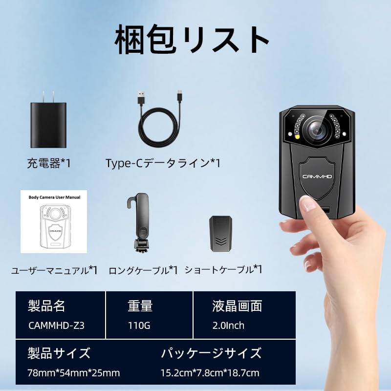 CAMMHD 1440P Z3 ボディカメラ 3000mAh 10-12時間ウェアラブルカメラ IP65防水 ナイトビジョン 130°広角 警察法執行機関 セキュリティ 個人 屋外に適しています ボディカム