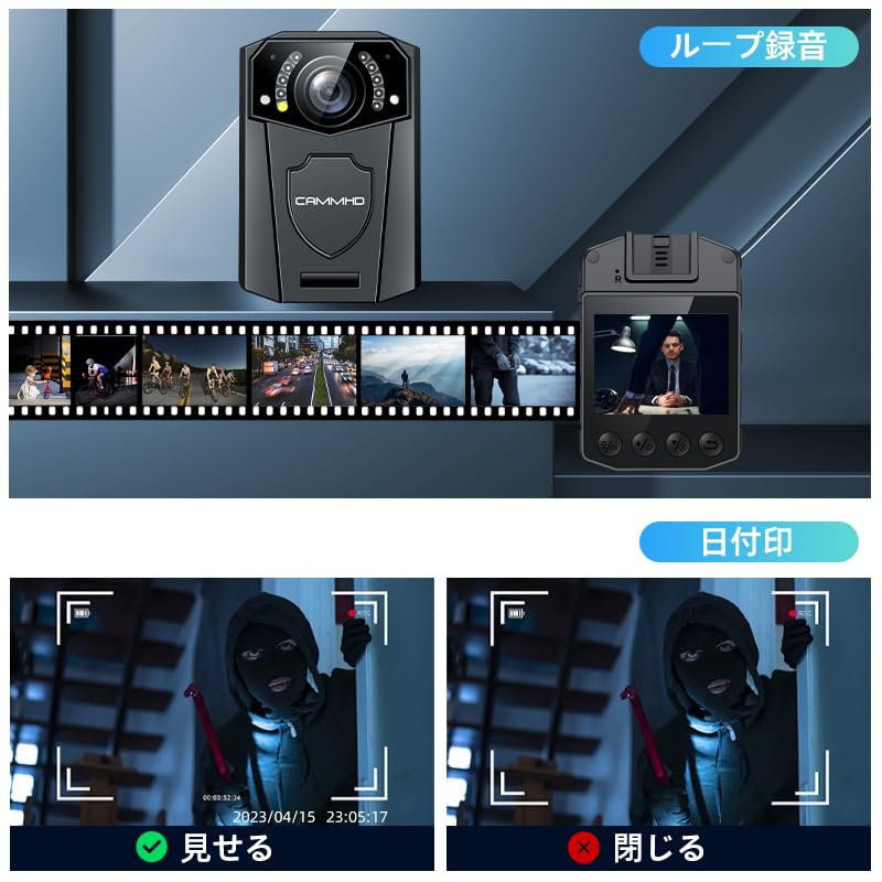 * 多機能ボディカメラ : ボディカメラの重さは110グラムで、メモリカードは含まれていないので、別途用意する必要があります。紛争現場、緊急事態、犯罪現場の記録に使用できます。警察、運転記録、警備員、ウォーキング、旅行のキャリー、防犯などに適しています。また、個人、家族、財産の安全保証でもあります。日本語説明書が付属しており、1年間の保証が付いております