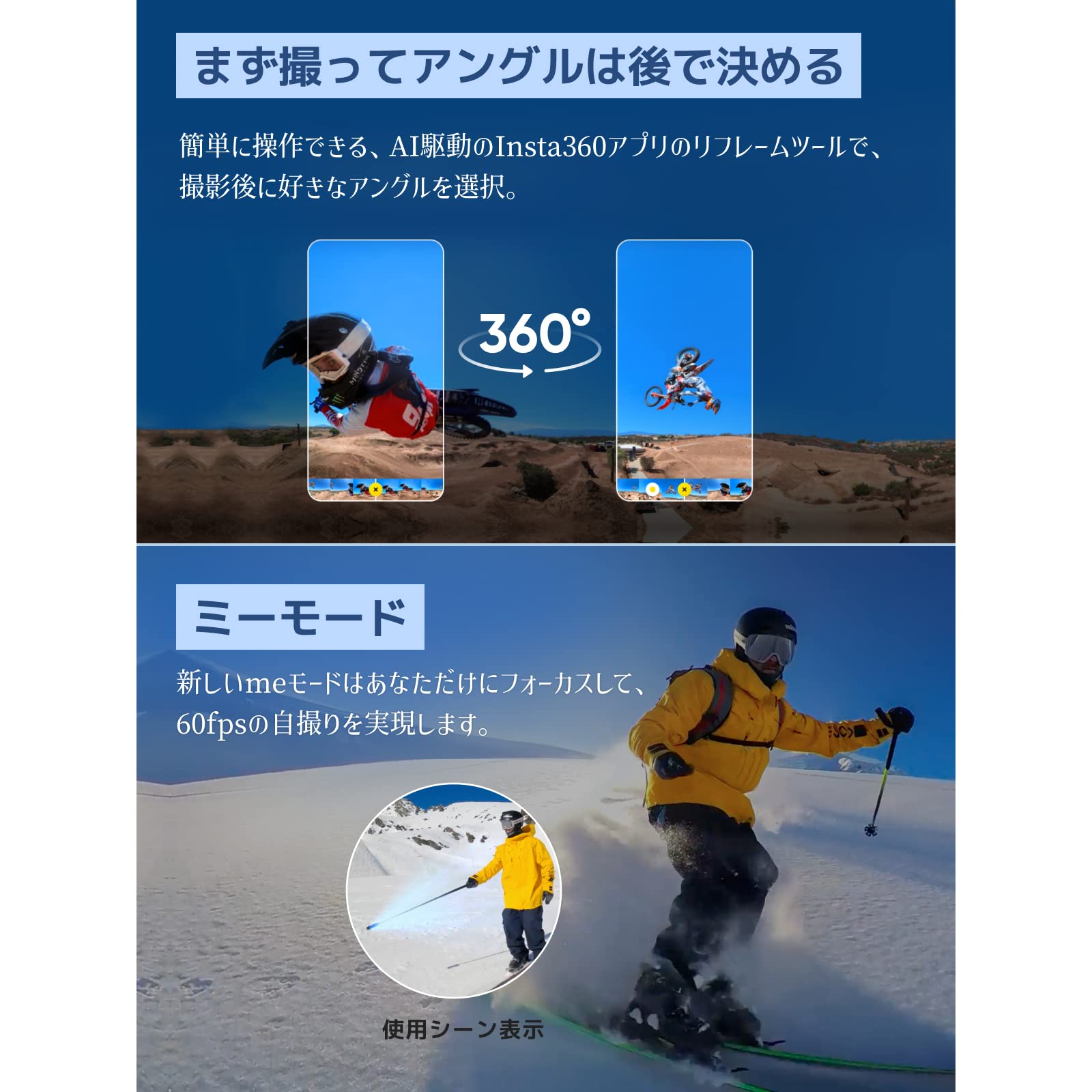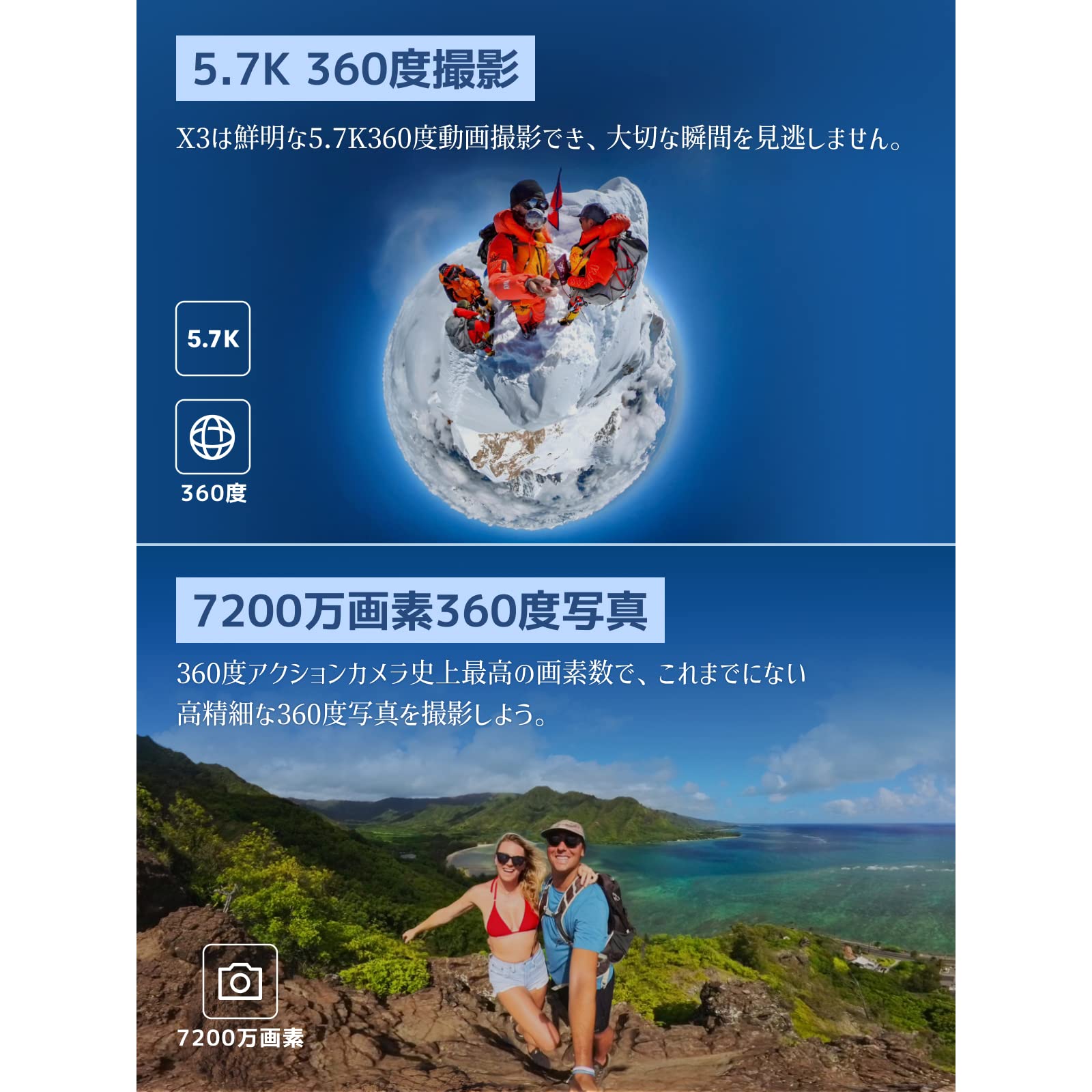 * 7200万画素 360度写真 & 1/2インチセンサー:360度アクションカメラ史上最多の画素数。 X3の新しい1/2インチセンサーは鮮やかな5.7K 360度映像でアクションを捉えます。 360度写真 7200万画素でこれまで以上にディテールにこだわった写真を撮影できます。