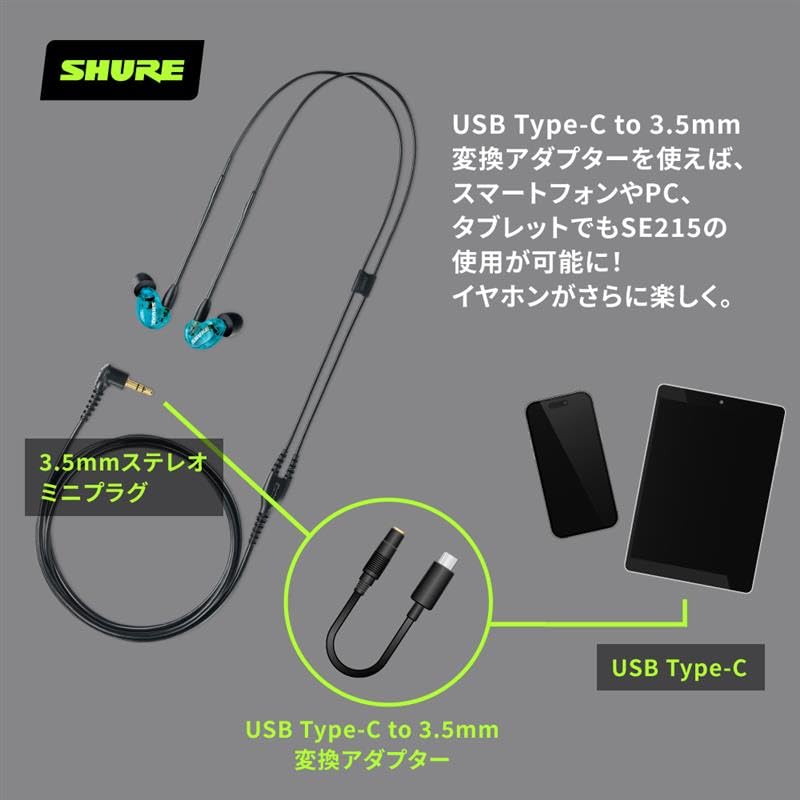 ■ 【3.5mmジャック非搭載のデバイスでも利用可能】USB Type-C to 3.5mm 変換アダプターを使えば、3.5mmジャックがないUSB Type-C対応のPCやスマートフォン、タブレットでもSE215をご利用いただけます。