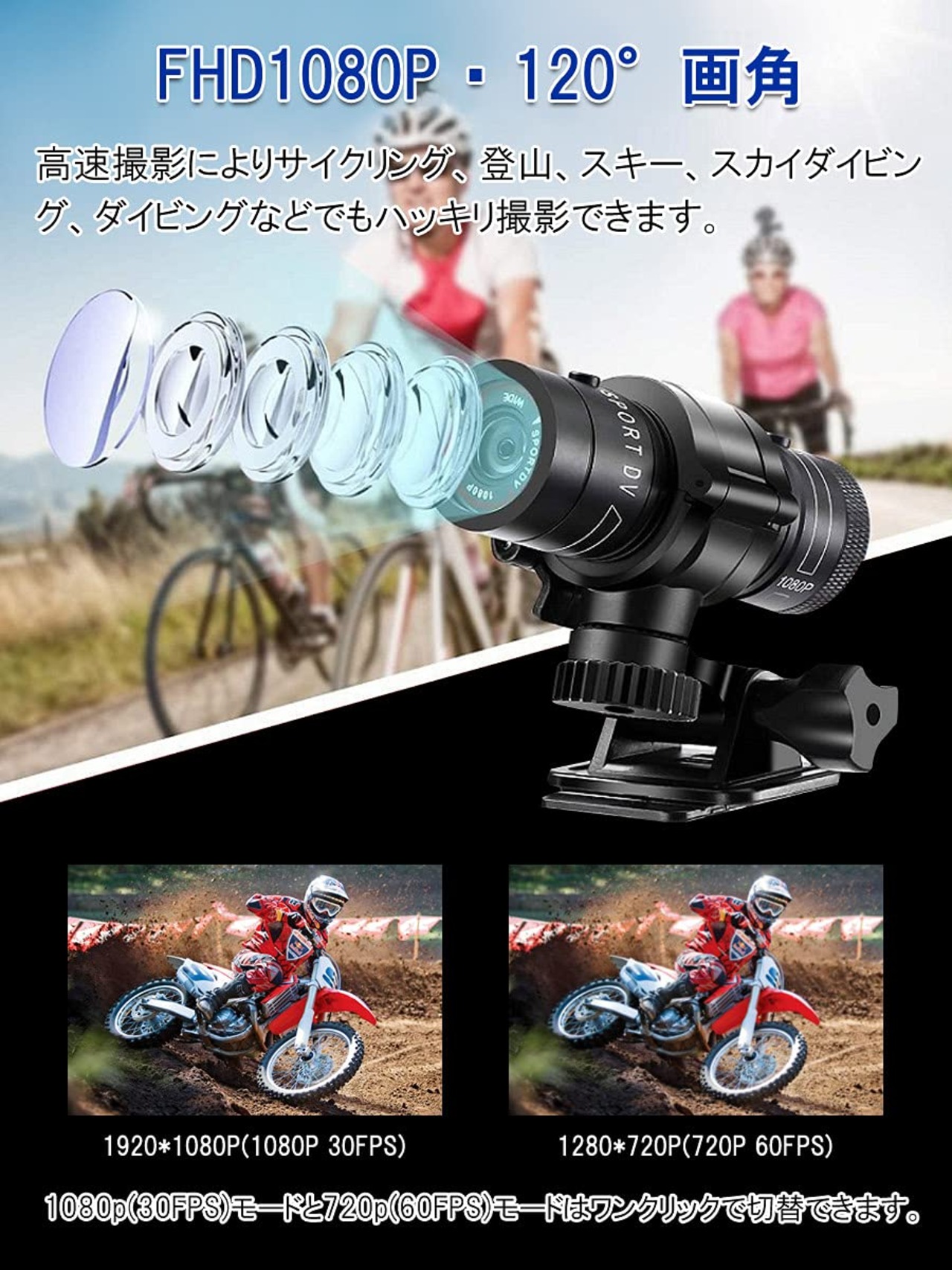 * ドライブレコーダー 自転車 バイク スポーツカメラ 200万画素 マルチ機能カメラ高速撮影対応 事故やトラブルの証拠映像に リアルタイム 登山、スキー、サイクリング、スカイダイビング、ダイビング、釣り、狩猟