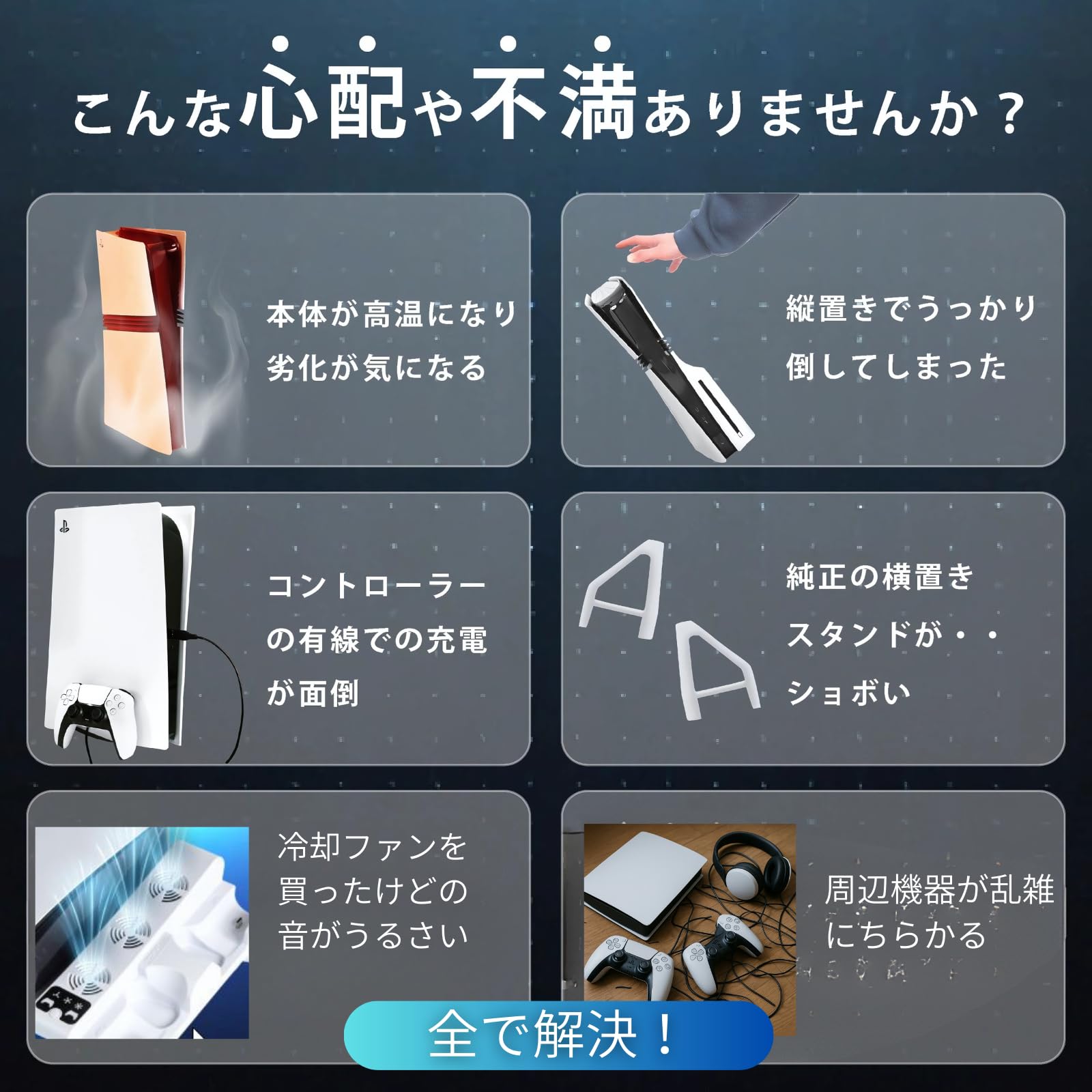 * 【冷却・充電・収納がこれ1台で完結】 ATURIKA製PS5縦置きスタンドは、PS5 Pro・PS5・PS5 Slim(ディスク版/デジタル版)すべてのモデルに対応。 高回転ファンによる3段階風速冷却、コントローラー2台+USB機器同時充電、さらにヘッドセットやリモコンもまとめて収納可能な多機能スタンドです。