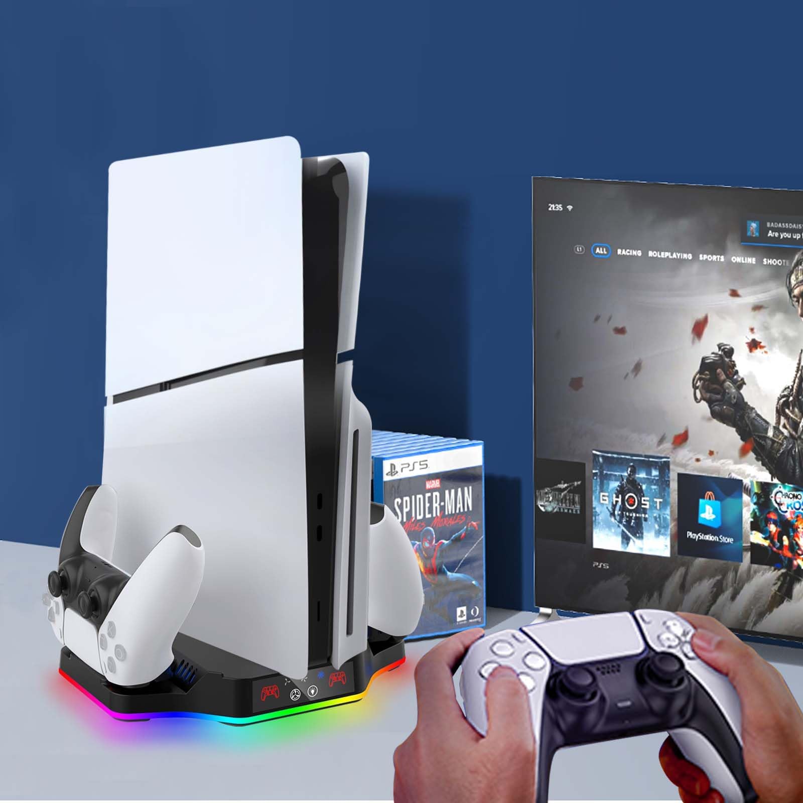 ps5 slim スタンド 縦置き PS5/PS5 Silm スタンド 冷却ファン付き PS5 Silm コントローラー 充電器 3段階風速調整可能 ドック 2台同時充電充電指示ランプ付 収納 RGB照明モード付 PS5 slim の通常版とデジタル版両対応