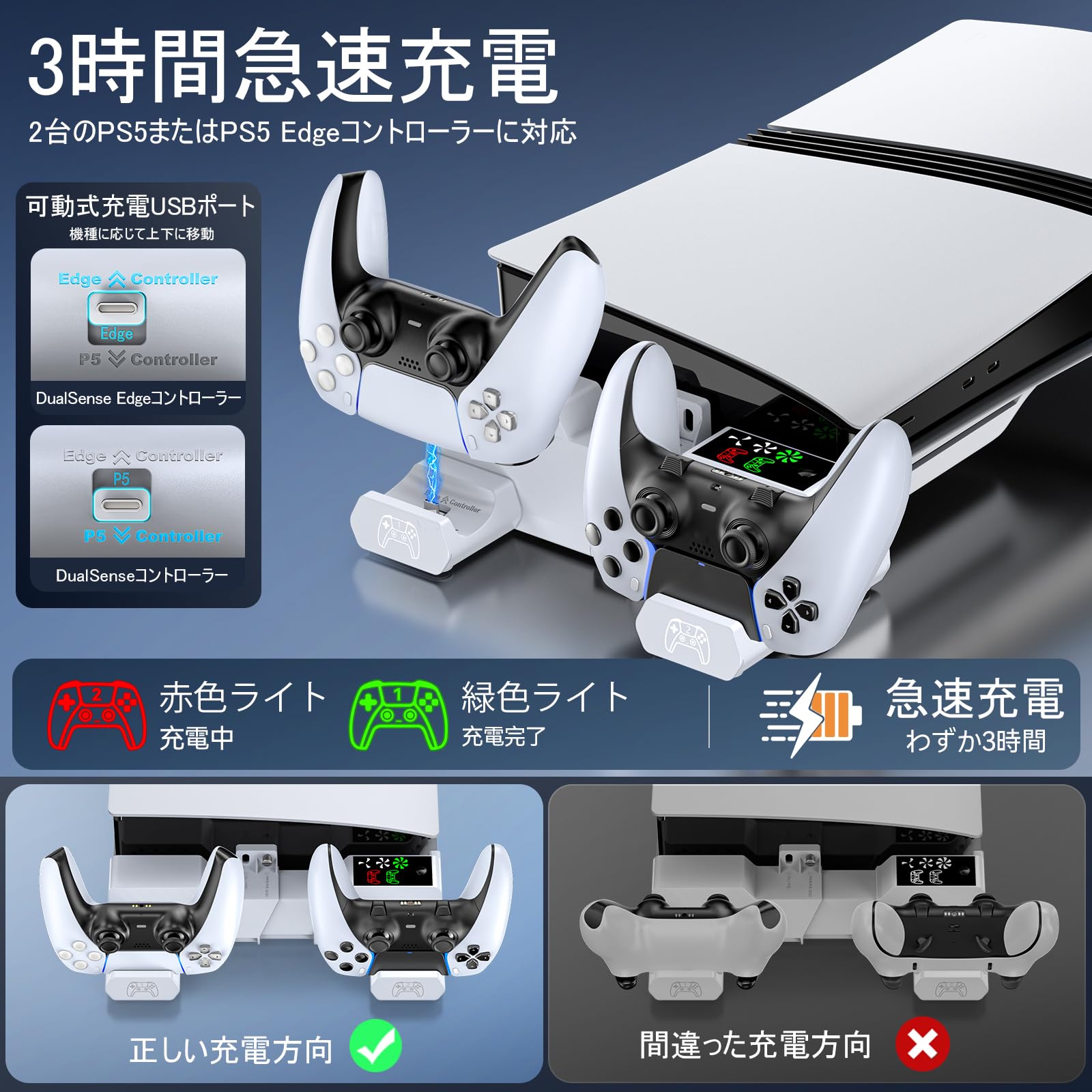 * 【PS5コントローラー2台同時充電】PS5コントローラー 充電スタンドは、純正PS5/PS5 Edgeコントローラーを置くだけ充電することができます。充電中、コントローラーのインジケーターは赤色で点灯し、充電完了になると緑色に点灯します。