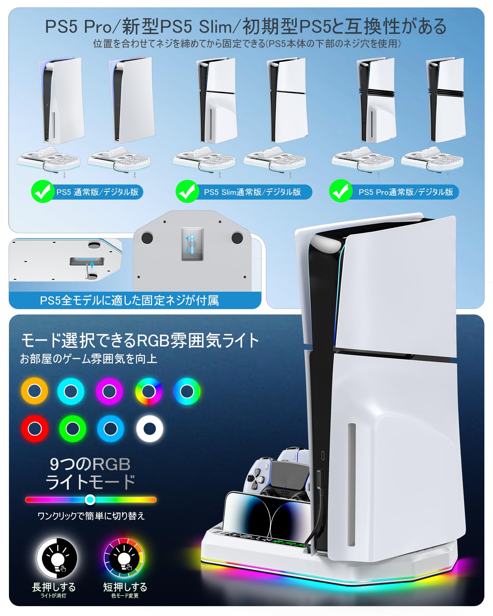 * 【PS5 Pro/PS5 Slim/PS5対応】PS5スタンドはPS5 Pro、新型PS5 Slim、旧型PS5の通常版とデジタル版両方に対応できます。PS5本体の下部のネジ穴を使用してスタンドのネジ穴を合わせて付属のネジを締めてから固定します。