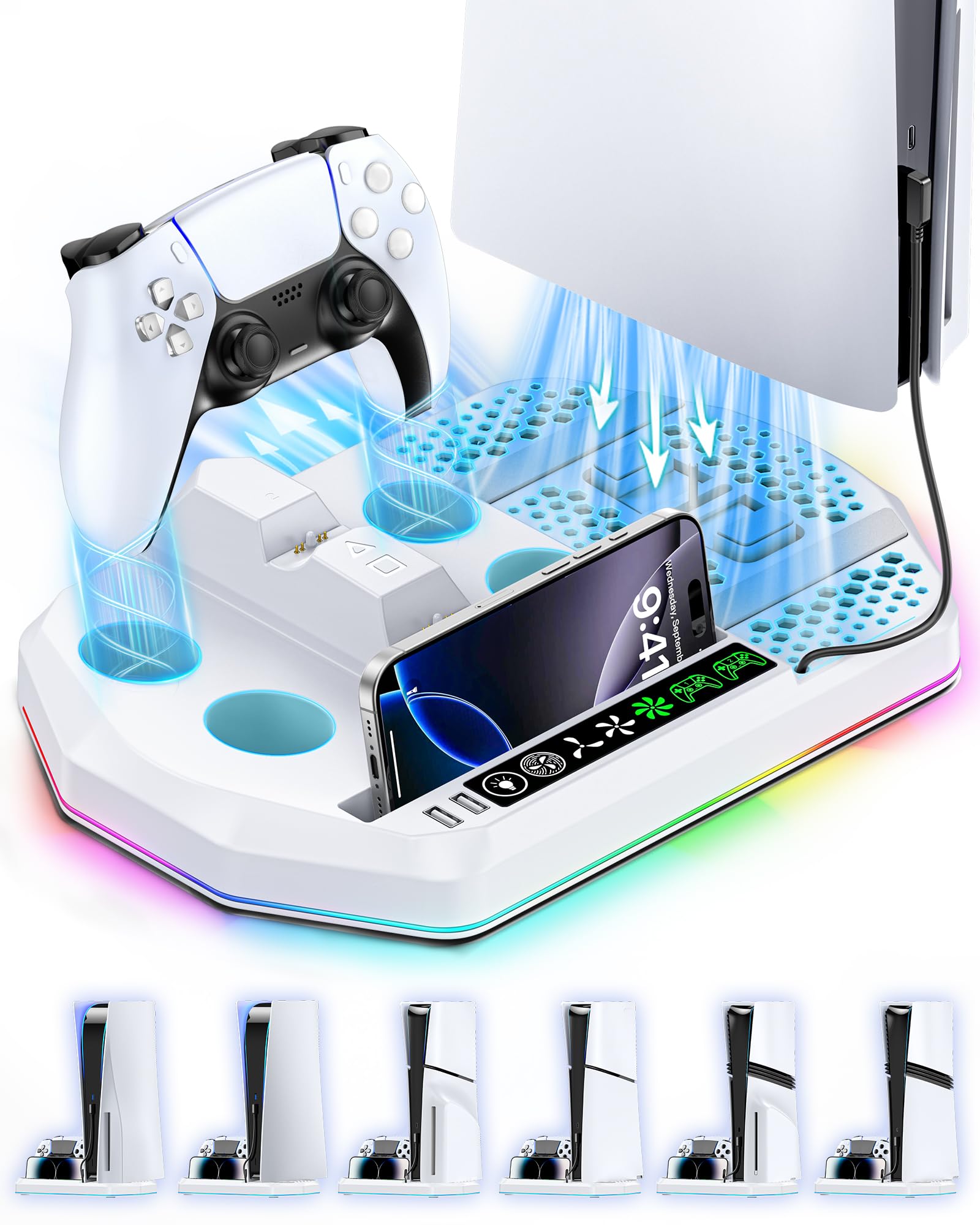 PS5 Pro/PS5 Slim/PS5対応 PS5 縦置き 冷却 スタンド 3段階風速調整可能 2台PS5/Edgeコントローラー 充電器 置くだけ充電可能 多機能収納 放熱対策 LED指示ランプ付 RGBライト付 新型 プレステ5 スリム 周辺機器 ホワイト