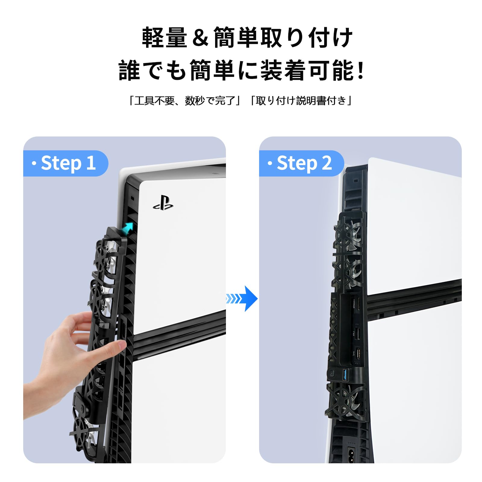 * 【USB給電式&USB3.0データポート搭載】 PS5本体のUSBポートから直接給電する設計で、外部電源は不要。配線を増やさず、すっきり設置できます。さらにデータ機能付きUSB3.0ポートを搭載しているため、冷却ファンを使用しても本体のUSBポートを占有せず、コントローラーや外付けHDDなどを引き続き利用可能。給電とデータ接続の両方を両立した構造で、Slim・Proいずれでも快適な接続環境を維持できます。
