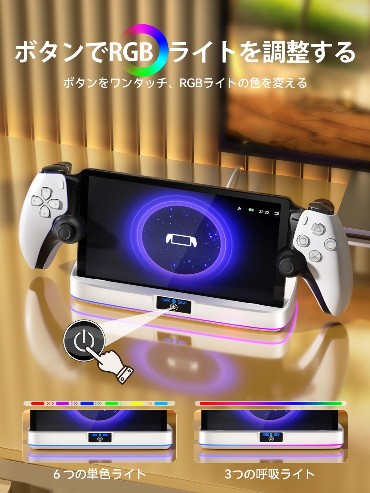* 【RGBライト& LED表示ライプ付き】PS5 PS Portal 充電器が搭載したRGBライトは、スイッチボタンを押すだけで異なるRGBライトモードを切り替えて、6 つの単色ライトと 3つの呼吸ライトが含まれて、クールなエフェクトでゲーム体験を向上できます。LED表示ライプも付いて、青いライトは充電中を示し、緑のライトはフル充電/スタンバイ中を示します。PS5 PS ポータルの充電状況を一目でわかります。