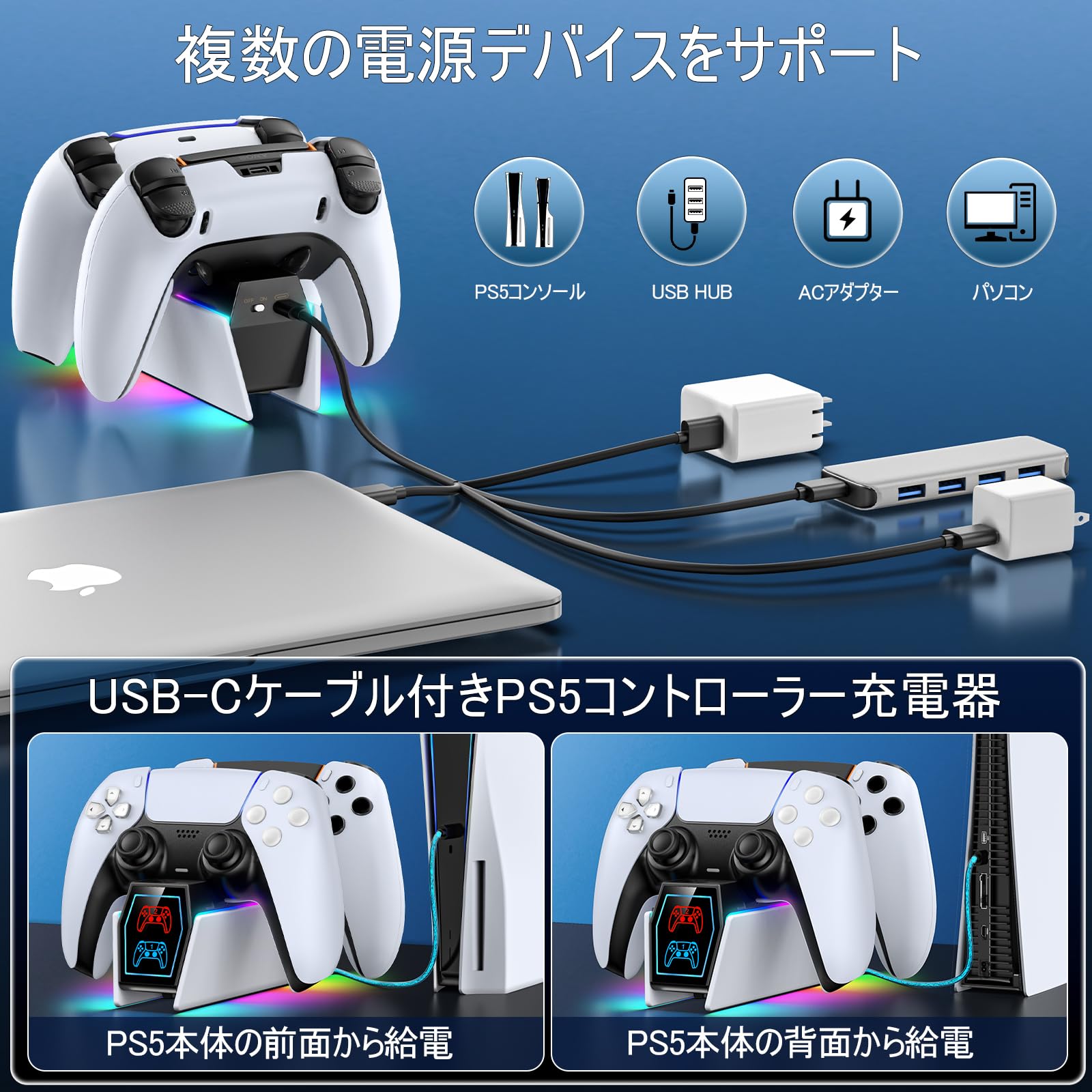 * 【複数の給電方法】デュアルセンス充電スタンドにはUSBケーブルが付属し、PS5コンソール、USB HUB、パソコンなどから給電できます。