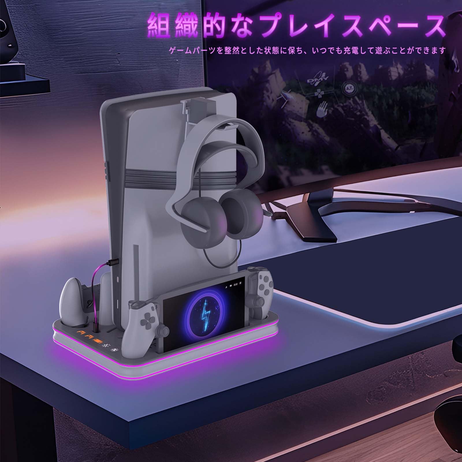 PS5 Pro/PS5 Slim/PS5対応 縦置きスタンド 【新登場5-in-1】ps5 コントローラー 充電スタンド 多機能冷却ファン for PlayStation 5 Pro 縦置き 新型 冷却ファン 充電指示ランプ付 PS5手柄和PS Portal掌机同時に充電 3段階風速調整可能 5種類の雰囲気灯 放熱 収納 PS5ディスク-デジタル兼用 ネジ付 USBケーブル付 ps5用