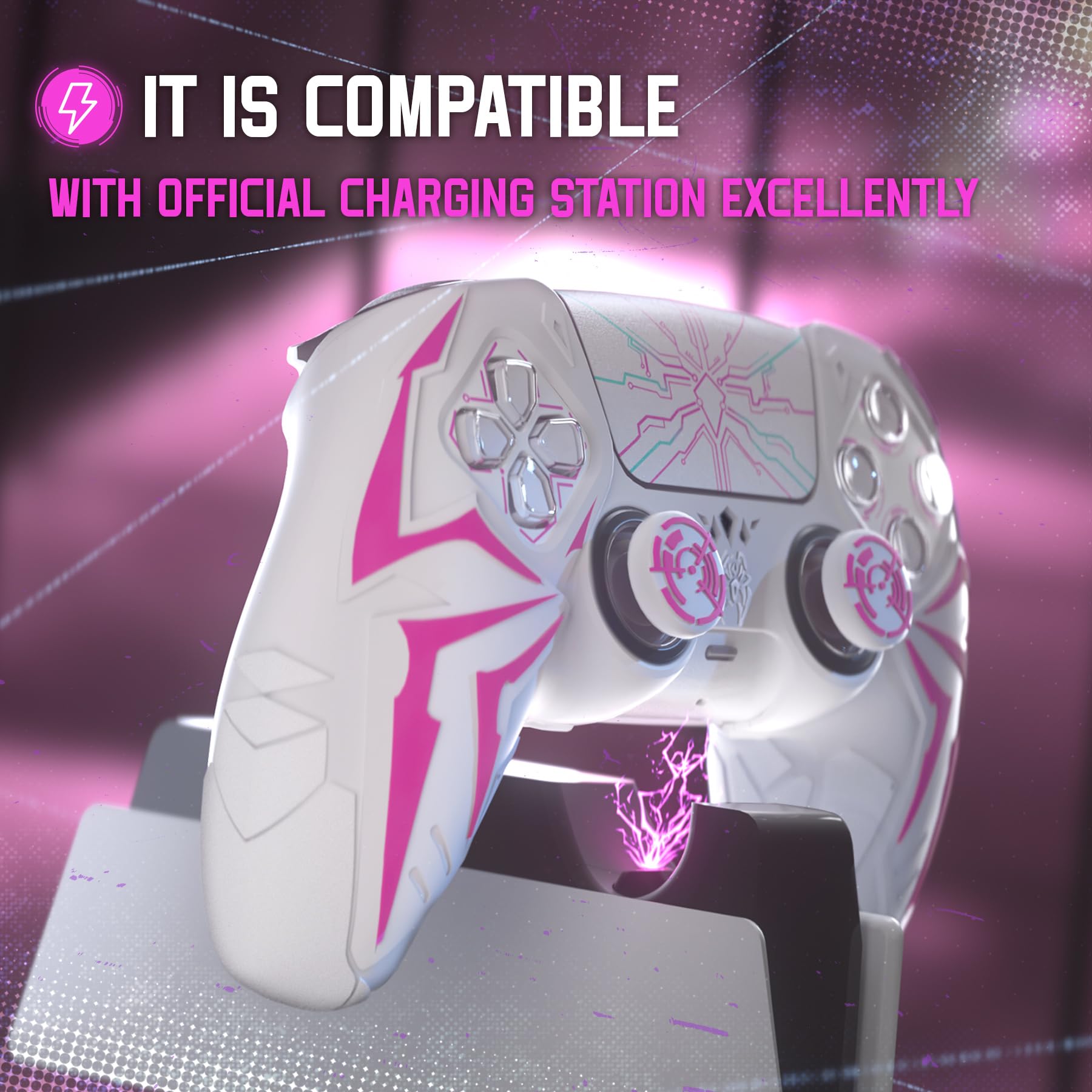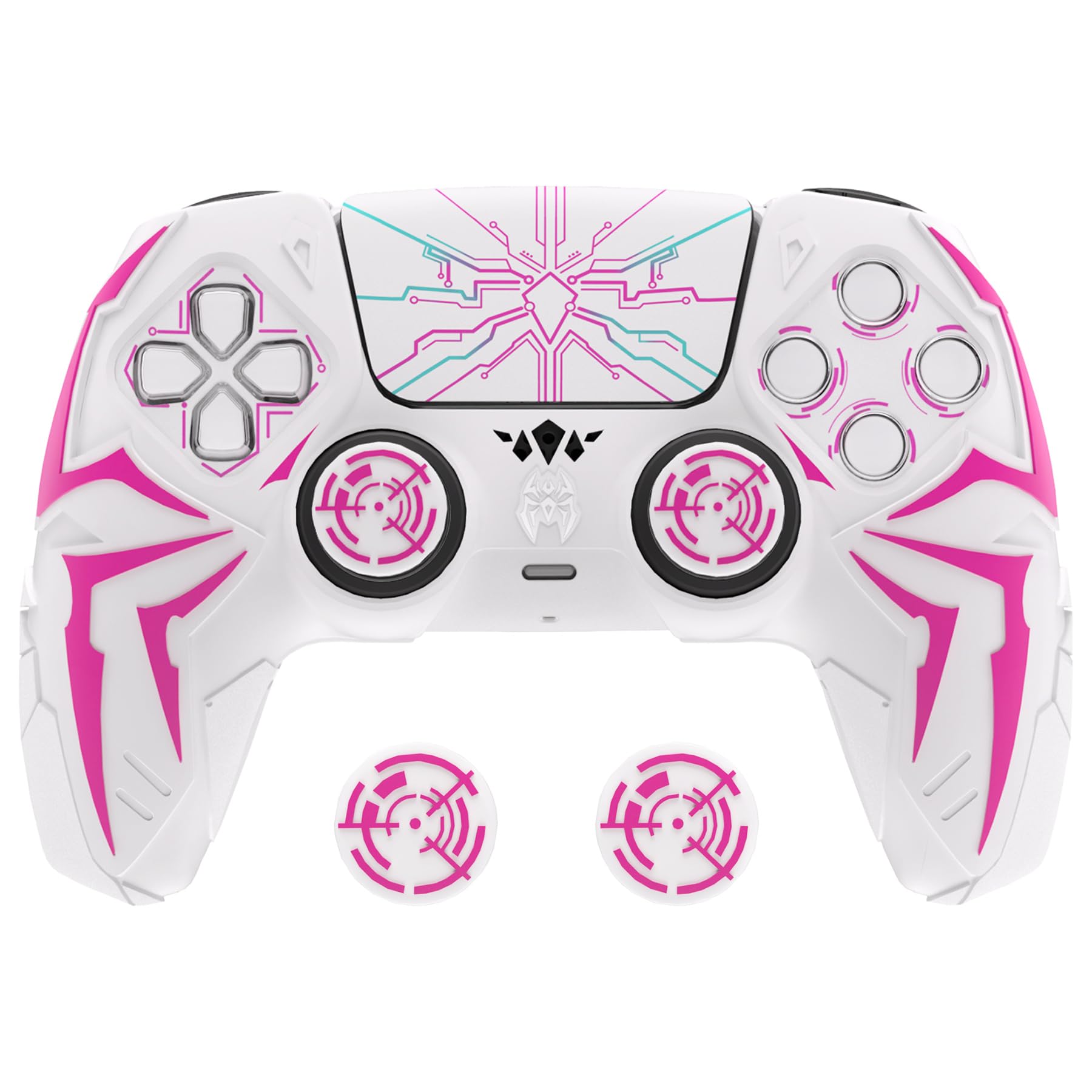PlayVital ps5コントローラー対応用シリコン保護カバー、サイバースパイダーデザイン、サムグリップキャップ2個やステッカー6枚付属、グリップ付き滑り止め、耐衝撃、充電ドック対応-ホワイト&ピンク