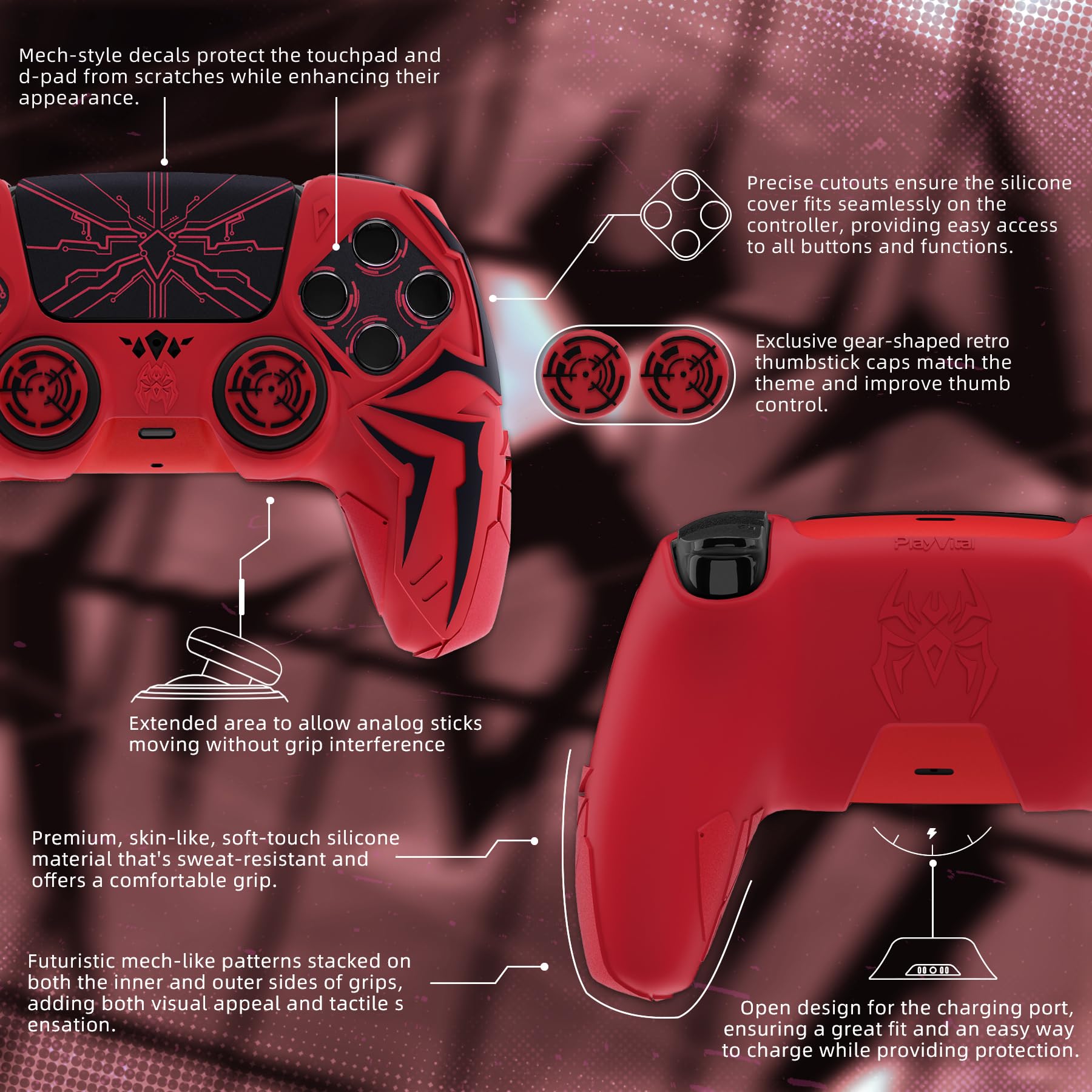 PlayVital ps5コントローラー対応用シリコン保護カバー、サイバースパイダーデザイン、サムグリップキャップ2個やステッカー6枚付属、グリップ付き滑り止め、耐衝撃、充電ドック対応-レッド&ブラック