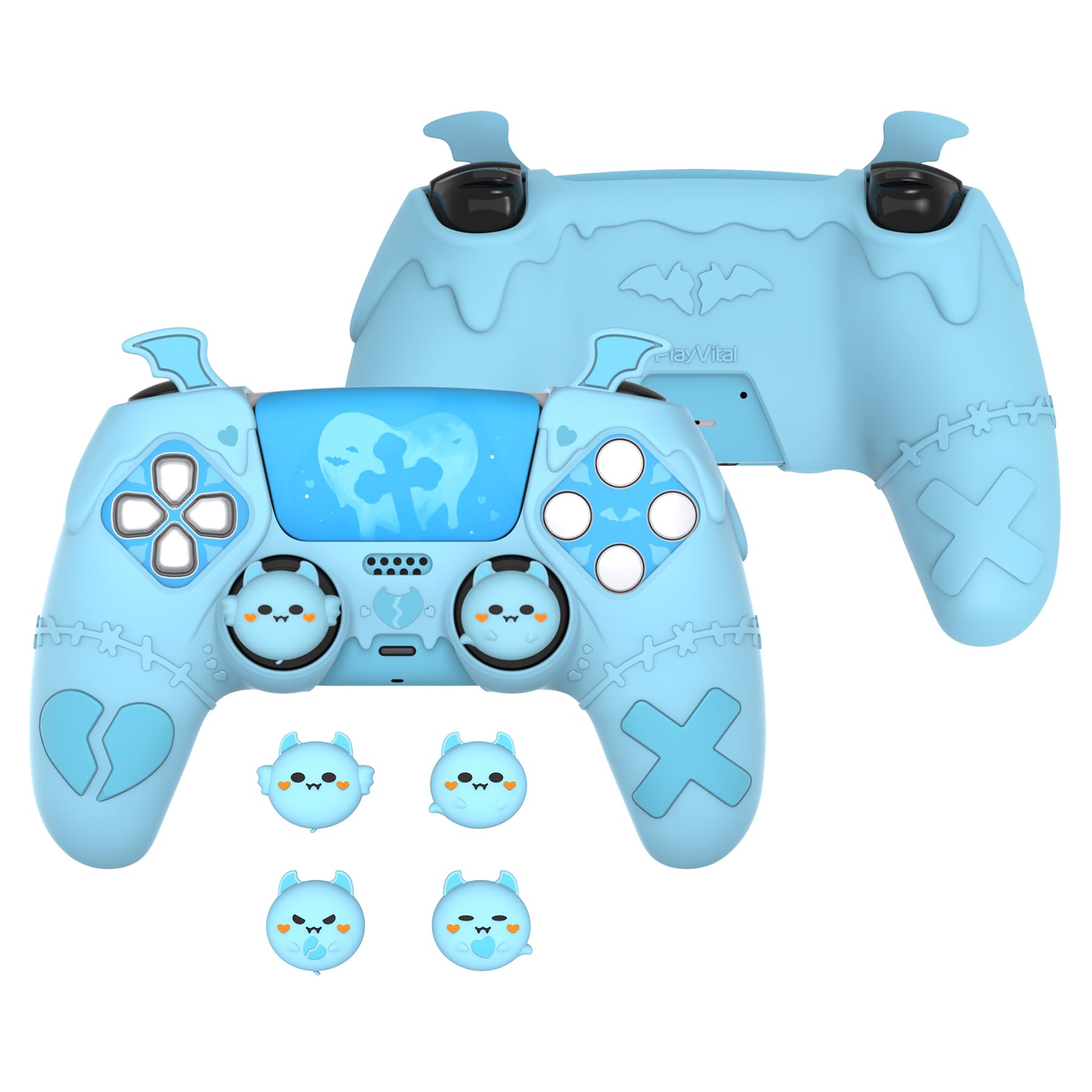 PlayVital Gothic Imp ps5コントローラー対応用可愛い保護カバー、サムグリップキャップ4個やステッカー6枚付属、ps5 コントローラー対応用グリップカバー、公式ps5充電ステーション対応【アクアブルー】