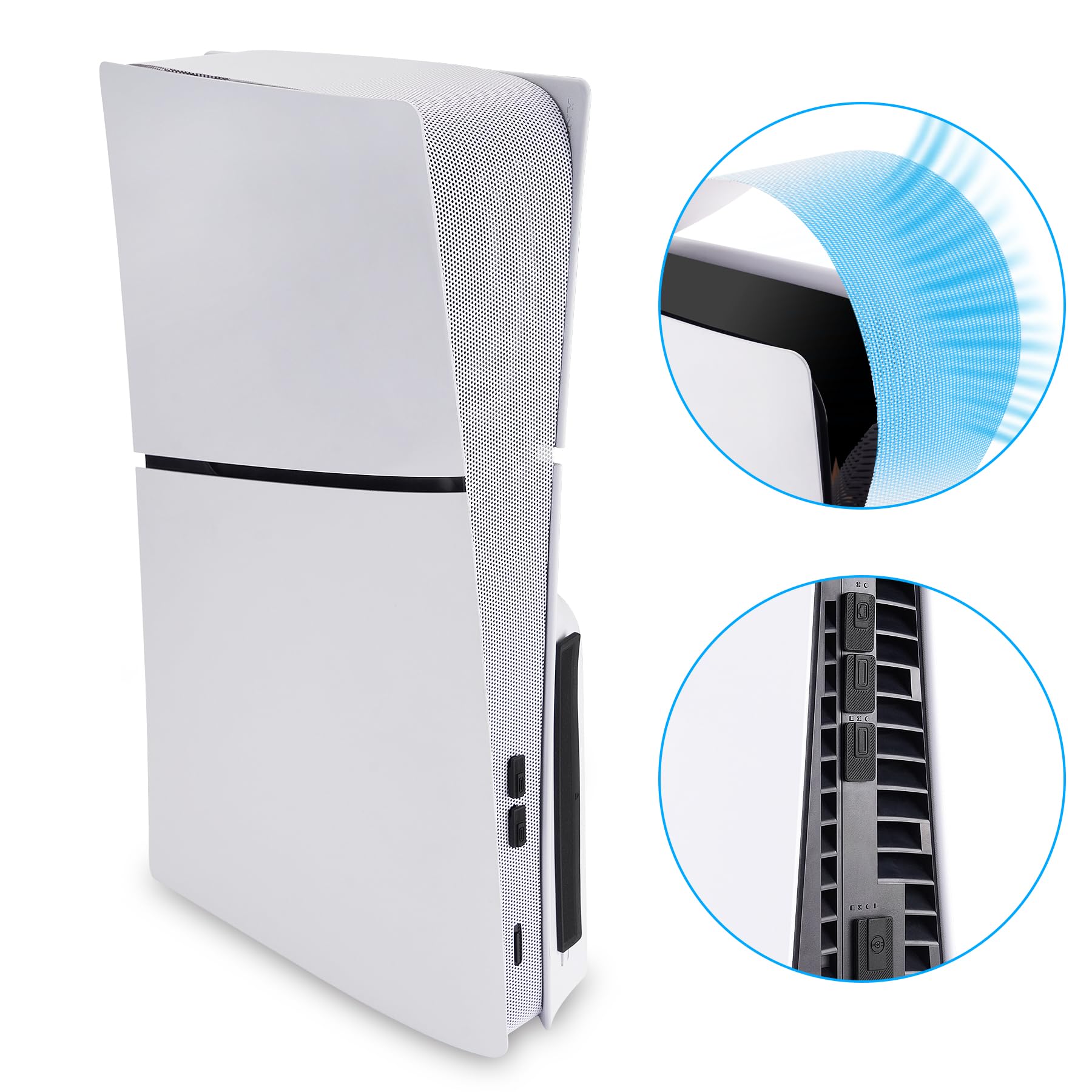 * 保護&通気性:防塵ネット1枚、フィルターを固定するための防塵プラグ2個、コネクターポート用の防塵ストッパー9個、ps5 Slimディスクポート用の防塵プラグ1個を含み、重要な部分をホコリの侵入から保護しながら、通気性を損ないません。