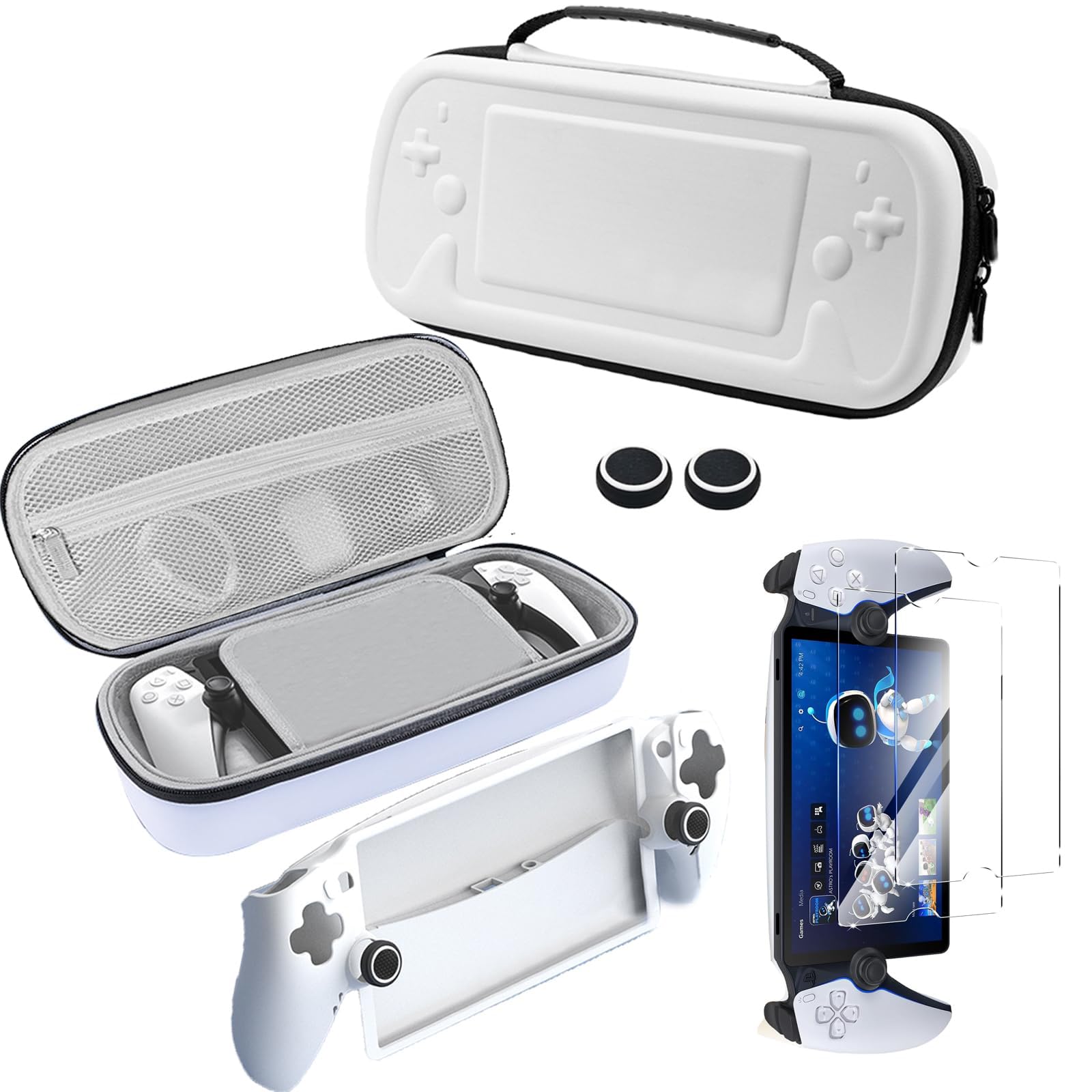 【新登場-4in1】PS Portal 用収納ケース 収納バッグ+PS Portal 用保護カバー+PS Portal 用リモートプレーヤー 用ガラスフィルム用 2枚入りTomistan- 日本硝子素材 9H 硬度 全透明 傷つけ防止 ハード耐衝撃 傷つけ防止 防塵 持ち運び便利 プレイステーションポータブル リモートプレーヤー用 収納ボックス バッグ (白)