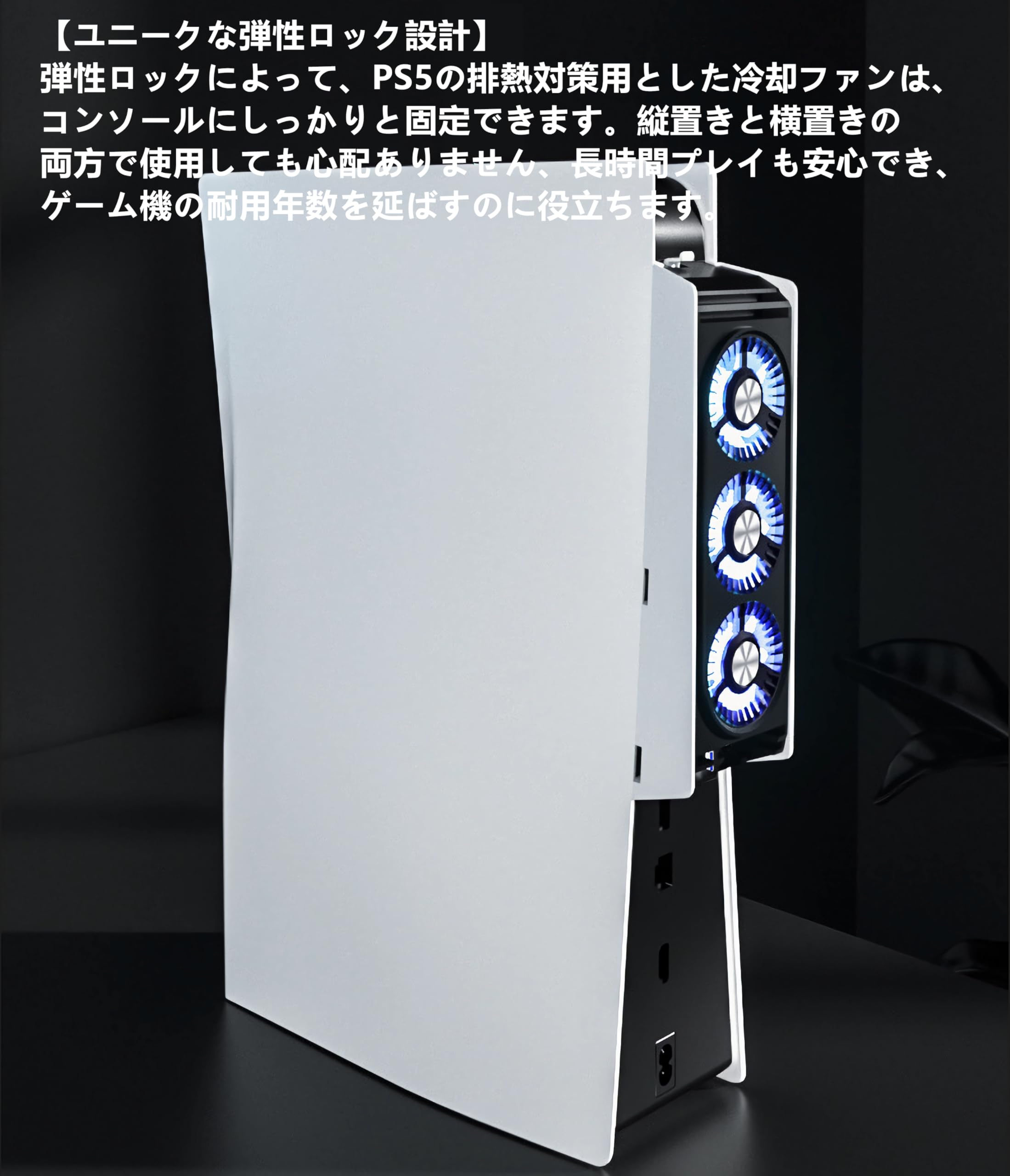 * 【ユニークな弾性ロック設計】弾性ロックによって、PS5の排熱対策用とした冷却ファンは、コンソールにしっかりと固定できます。縦置きと横置きの両方で使用しても心配ありません、長時間プレイも安心でき、ゲーム機の耐用年数を延ばすのに役立ちます。