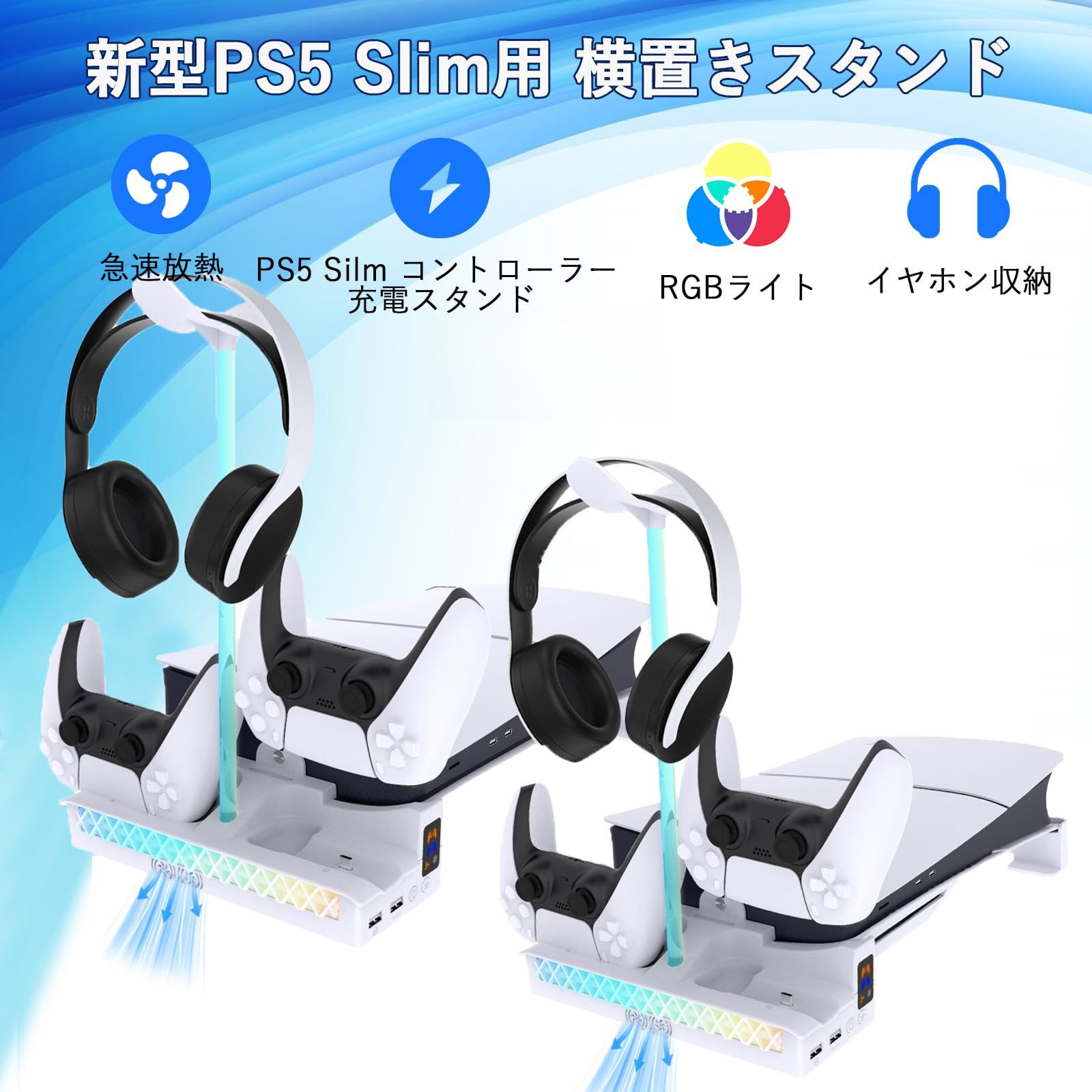新型PS5 Slim/PS5 Pro用 横置きスタンド 【新登場-充電&放熱ファン付】ps5 スタンド 放熱改善 3段階風速調整冷却ファン RGBライト付 転倒防止 地震対策 傷付き防止 PS5 アクセサリー 固定ネジ付 ps5 pro/PS5 slim用 ディスク & デジタル版対応