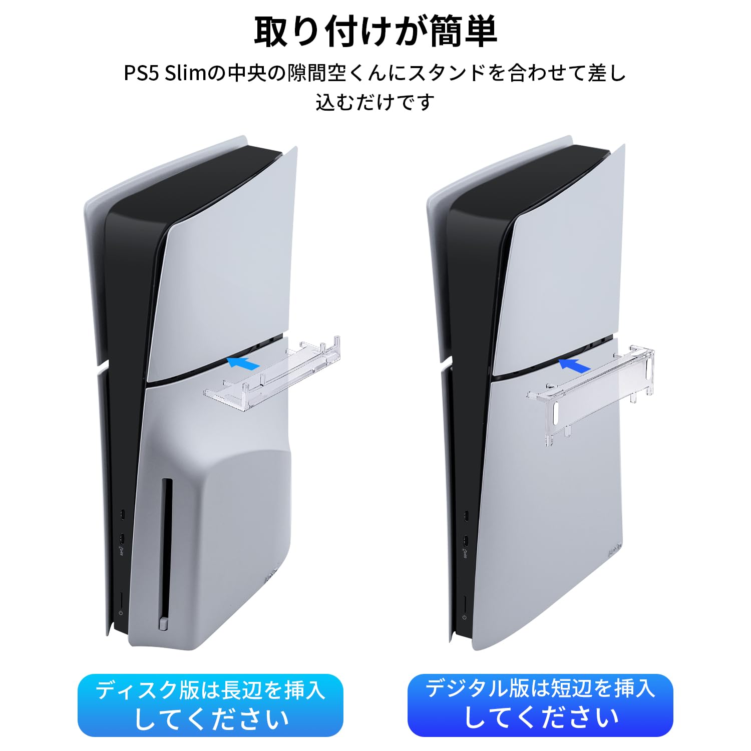 * 簡単な取り付け:PS5 Slim 本体の中央の隙間にある穴にスタンドを合わせて挿入するだけです。 デジタル版の場合は、スタンドの短い側を使用します。 ディスク版の場合、長辺が完璧なフィット感を保証します。