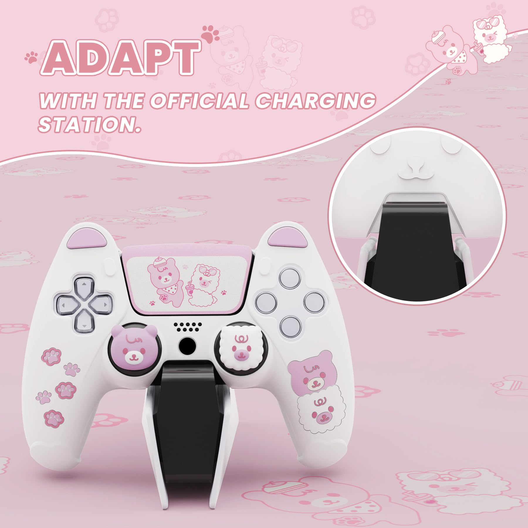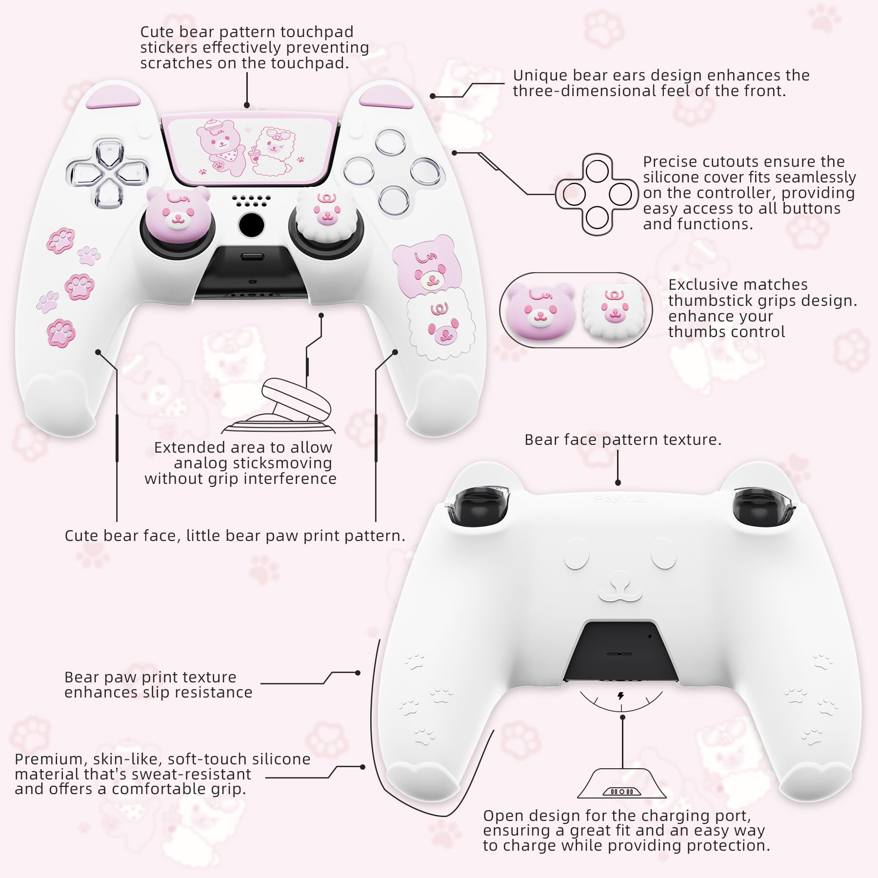PlayVital ps5コントローラーに対応用シリコンカバー、可愛いクマスタイルカバー付けたまま充電ステーションにも対応し、サムスティックキャップカバー&タッチパッドシール付属しています【ホワイト&ピンク】