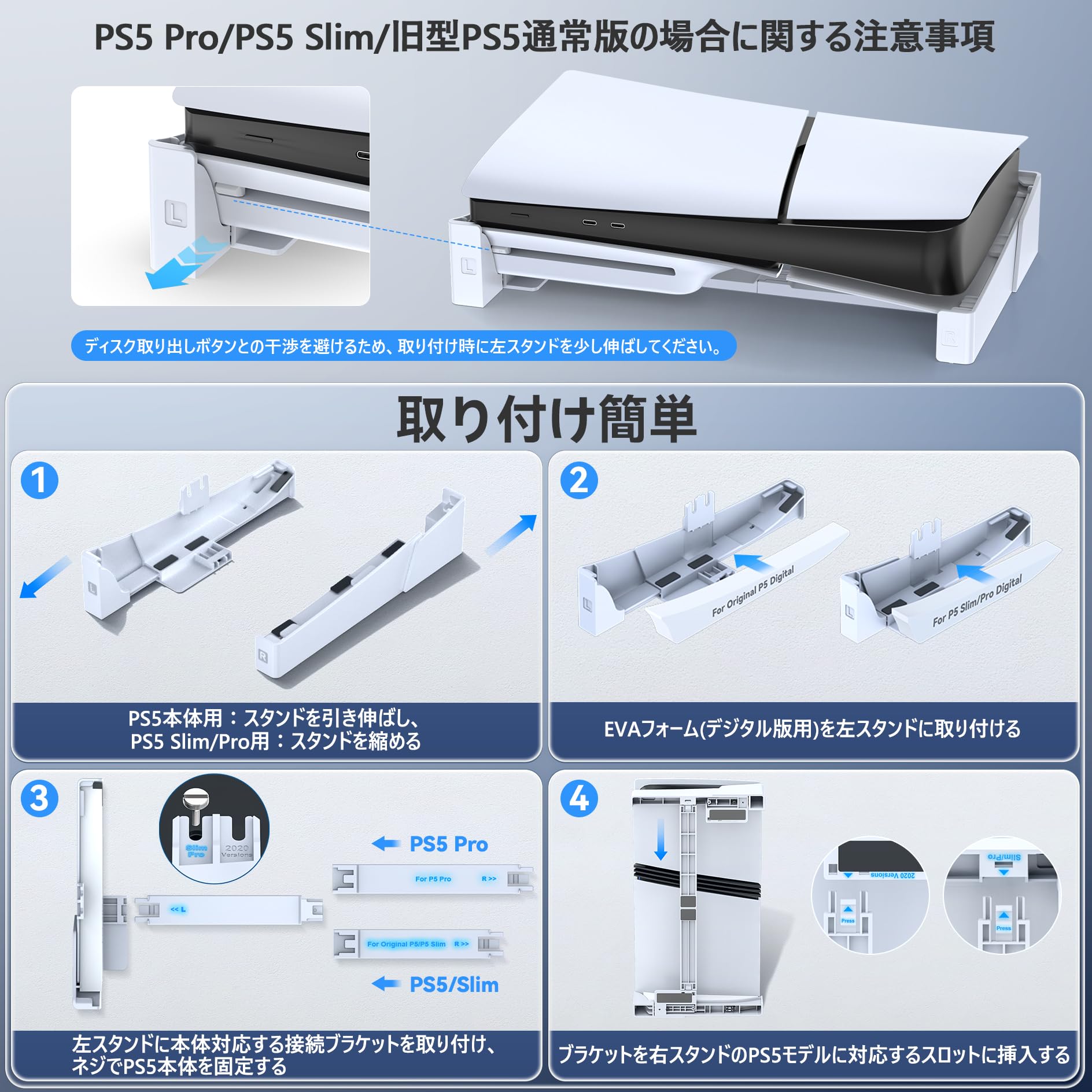 * 【取り付け簡単】ピッタリサイズで、取り付けは簡単です。調整可能なPS5スタンドを引き伸ばすと、初期型のPS5に対応し、スタンドを縮めると、PS5 Slim/Proに対応します。※PS5デジタル版を取り付ける前に、EVAフォームパッドをスタンドに取り付ける必要があります。