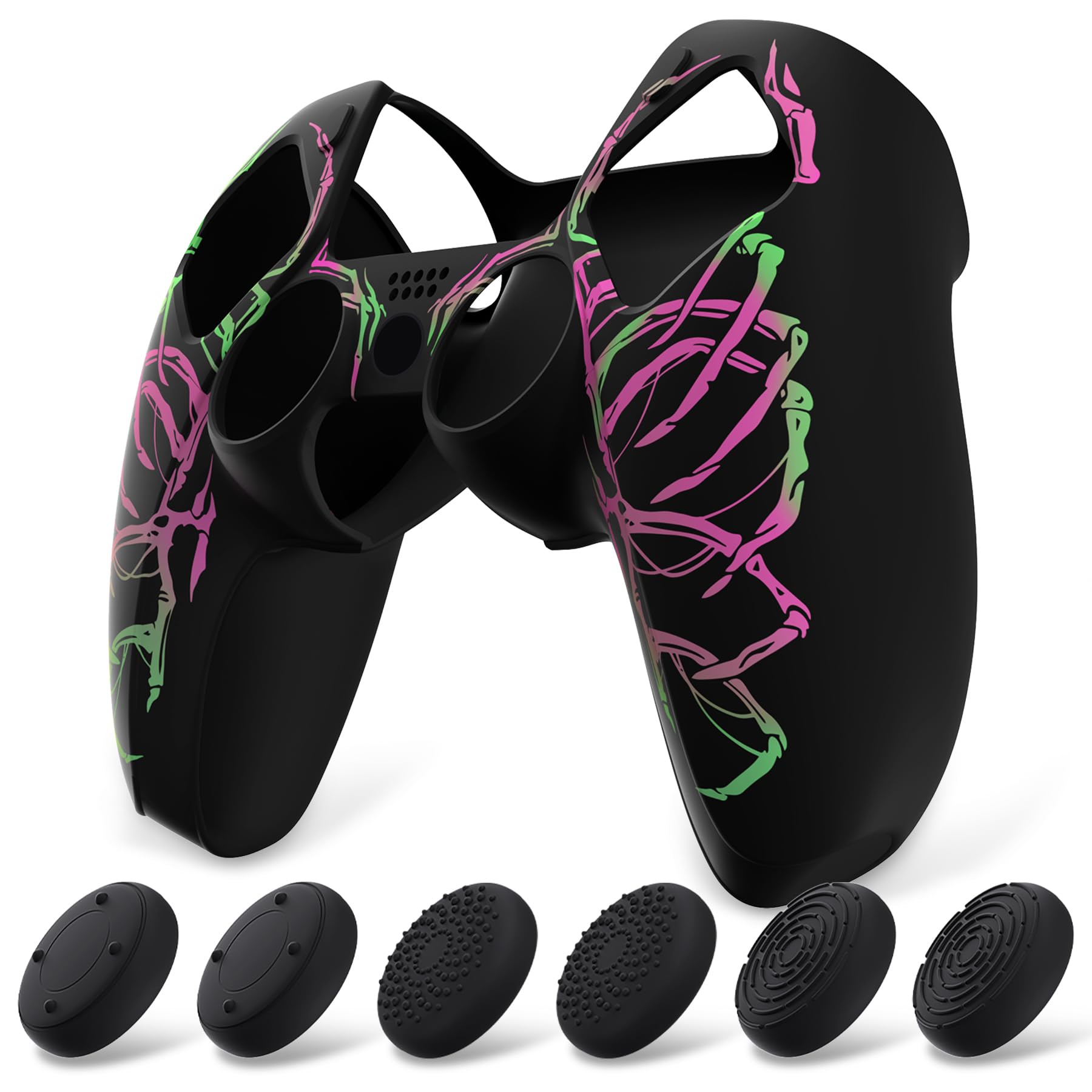 PlayVital ピュアシリーズパタンデザインps5コントローラーに対応用保護シリコンカバー、ps5コントローラーに対応用ソフトラバーグリップケースサムスティックキャップ六つ付き、充電スタンドに使用可能-【カービングスカル ピンク&グリーン】