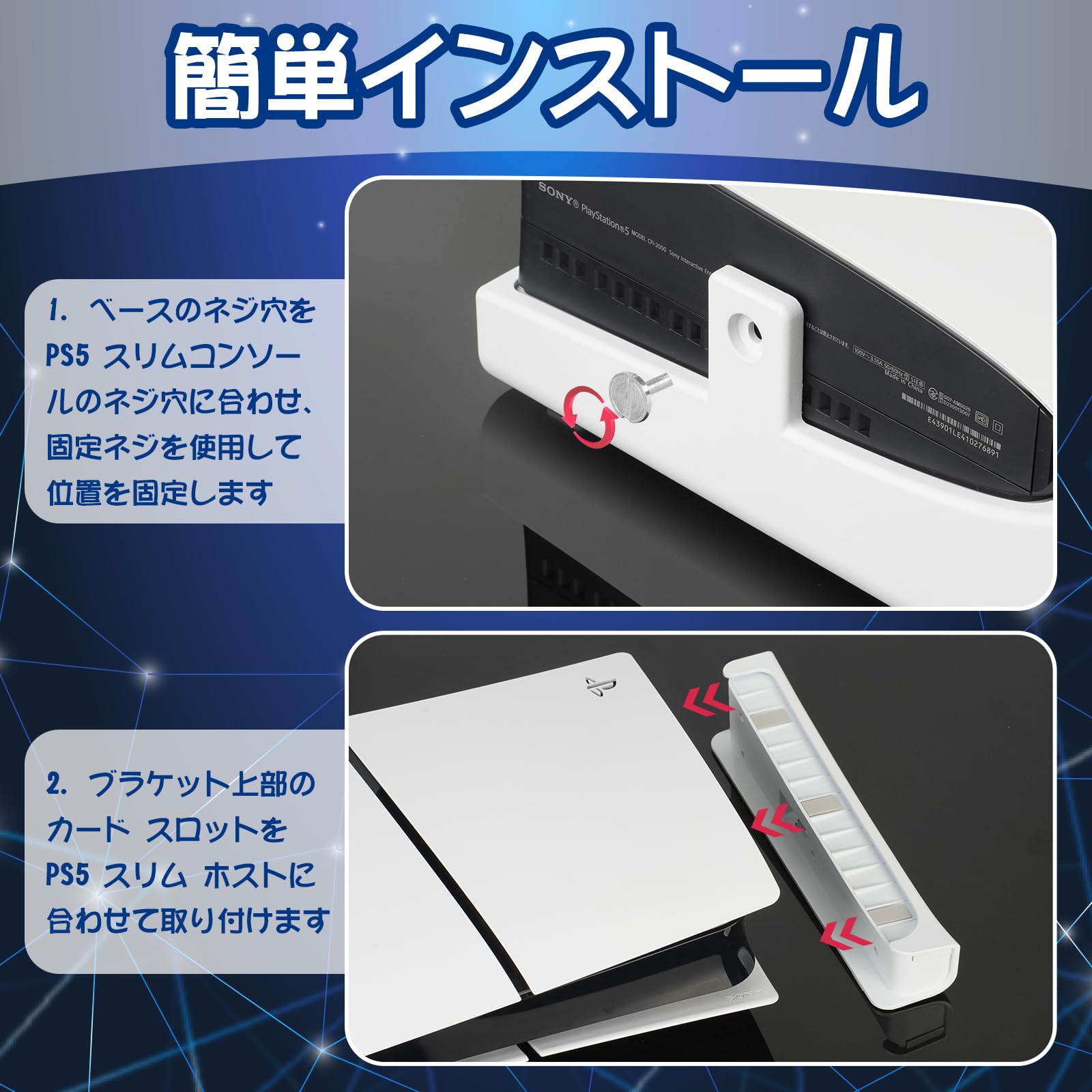 * 【取り付け簡単】PS5 Slim本体を横に置き、スタンドを両側に取り付け、ネジで固定するだけ。取り付け後はコンソールをしっかりと固定し、移動や振動にも強いです。