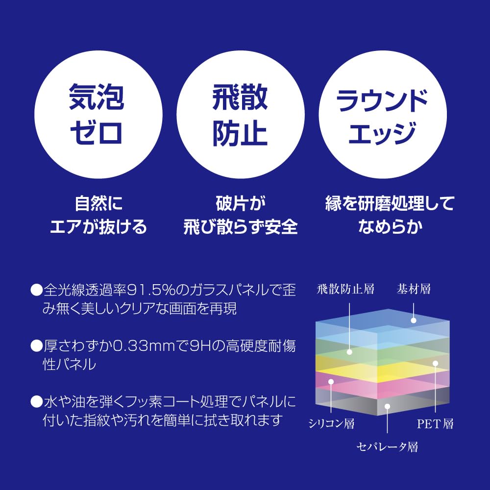 * 【衝撃に強いガラス素材を使用】本製品は、厚さわずか0.33mmながら、9Hの高硬度耐傷性パネルを使用しています。化学強化ガラスなので、従来のフロートガラスと比べて数倍の強さがあります。角にはラウンドエッジ加工が施してあるため、滑らかな手触りです。
