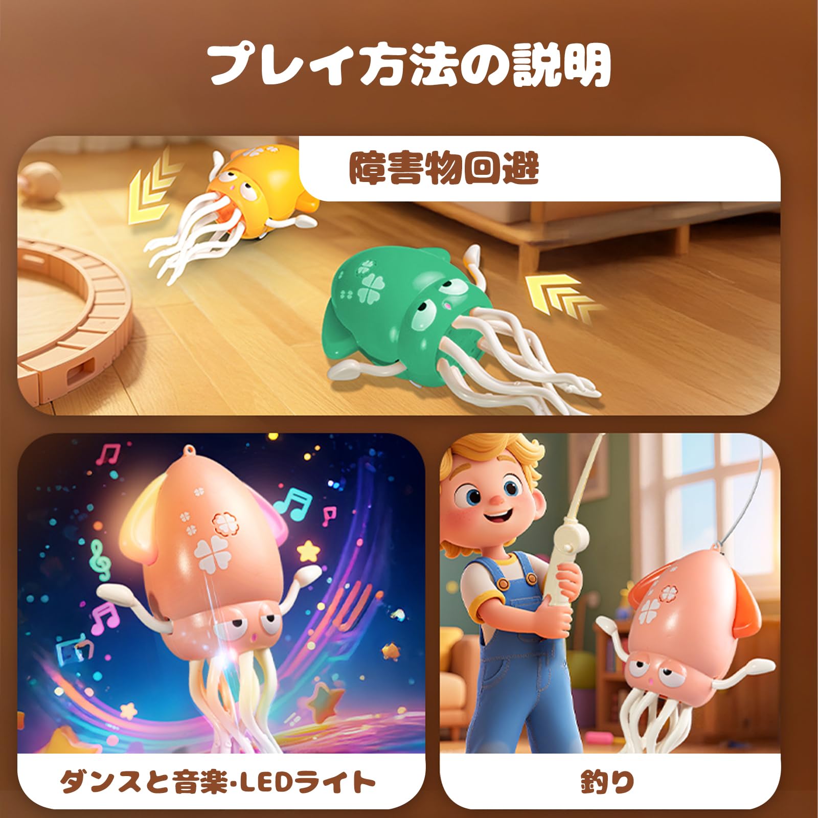 * 【ダンシングイカおもちゃ】 ユニークな動きで笑顔を誘う、魅力あふれるタコ型ロボット。鮮やかなライトと心地よい音楽がリズムに合わせて点滅し、楽しい時間を演出します。LEDライト&音楽機能:楽しい音楽に合わせてLEDライトが同期して点滅し、より魅力的な視覚効果を生み出します。