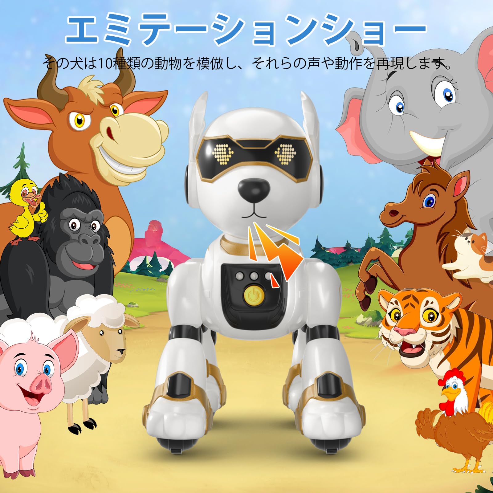* インテリジェントとスタント: この電子ペット 犬型ロボットは、リアルな動きで子供たちを魅了するだけでなく、模倣ショーでも素晴らしいパフォーマンスを発揮します。10種類の異なる動物の鳴き声を真似することができ、大象、猫、アヒル、豚、ゴリラ、虎、羊、牛、馬、鶏などの音を再現します。これらの楽しい模倣は、子供たちの感覚的な体験を豊かにし、動物界に対する好奇心を刺激し、教育的でエンターテイメント性の高い遊び時間を提供します