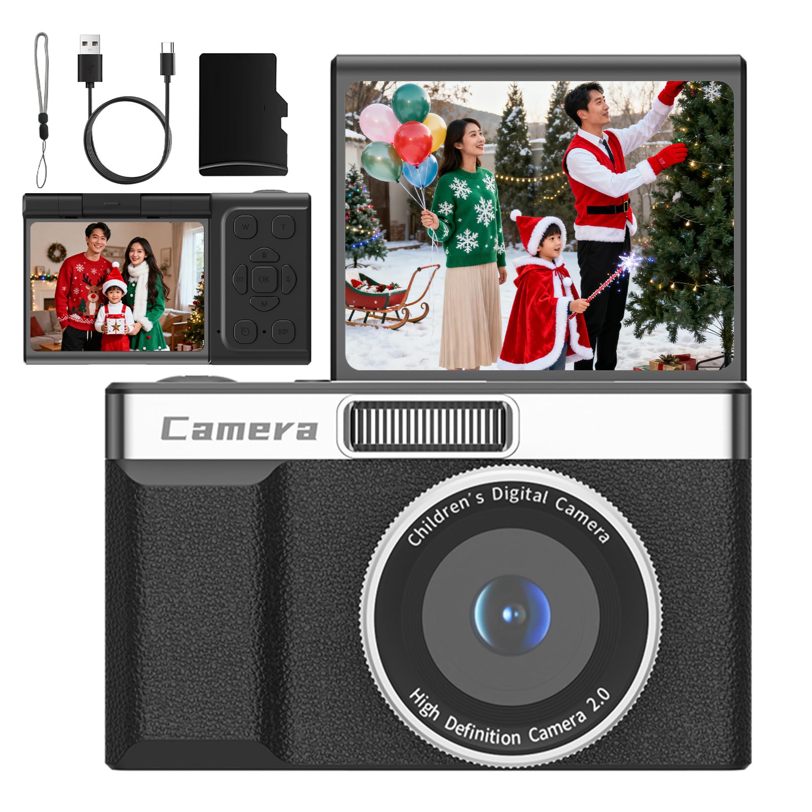 【クリスマス プレゼント】デジタルカメラ 5000万画素 自撮り 180°回転レンズ 子供向け トイカメラ 1080P動画撮影 デジカメ ミニカメラ キッズカメラ 小学生 子供用 32GB SDカード付属 内蔵ライト子供/学生/初心者に向け 日本語説明書(ブラック)