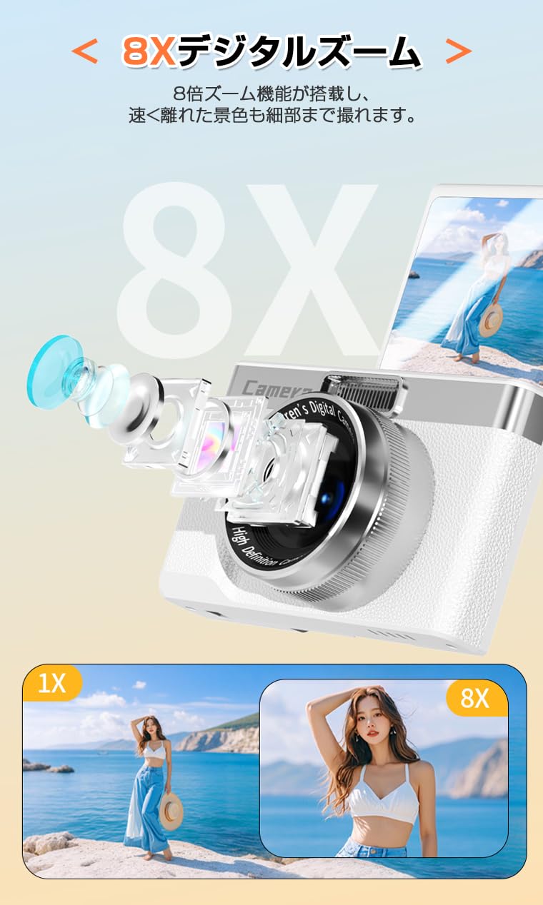 * 【2.4インチ大画面&180°回転スクリーン】デジタル カメラには 2.4 インチの画面が装備されており、表示と再生をより鮮明かつ直感的に行うのに十分な表示領域を提供します。画面を 180 度反転して自分の方を向くと、自分の表情や構図を簡単に確認できます。