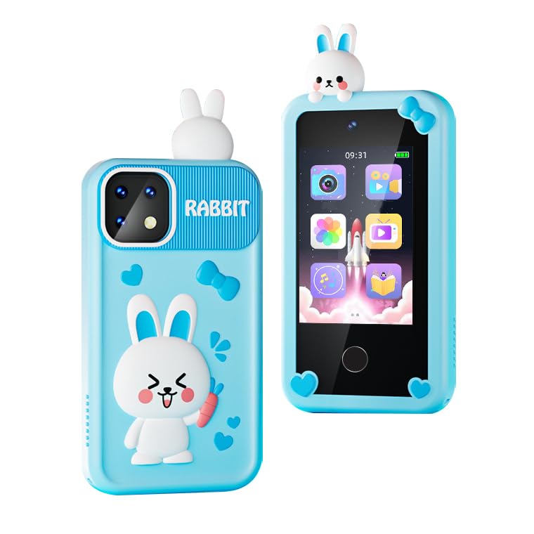 キッズスマホ おもちゃ 子供用 子ども スマホ スマートフォン 前後カメラ 自撮り 知育 英語学習 ユニコーン 恐竜 メモリーカード シリコンカバー ストラップ付 (ブルー, 兎)