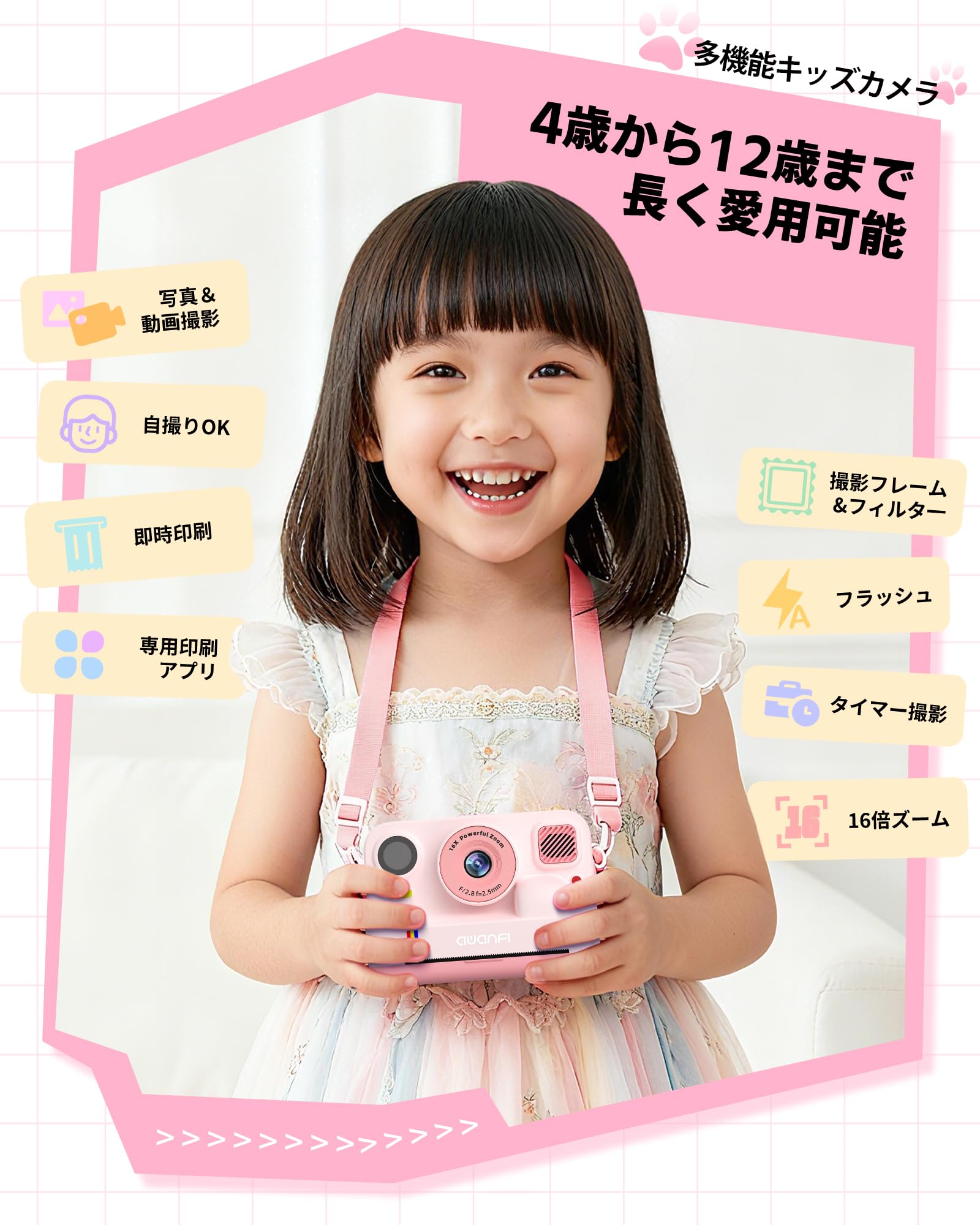 【インスタント印刷&スマホ写真プリント】AWANFI キッズカメラ プリントカメラ 3色感熱紙付き トイカメラ - 子供用デジタルカメラ 1080P動画 4800万画素 USB-C充電 1300mAh大容量 2.4インチ画面 - 誕生日 クリスマス 新年 プレゼント おもちゃ 女の子&男の子&小学生&3~12歳向け ピンク