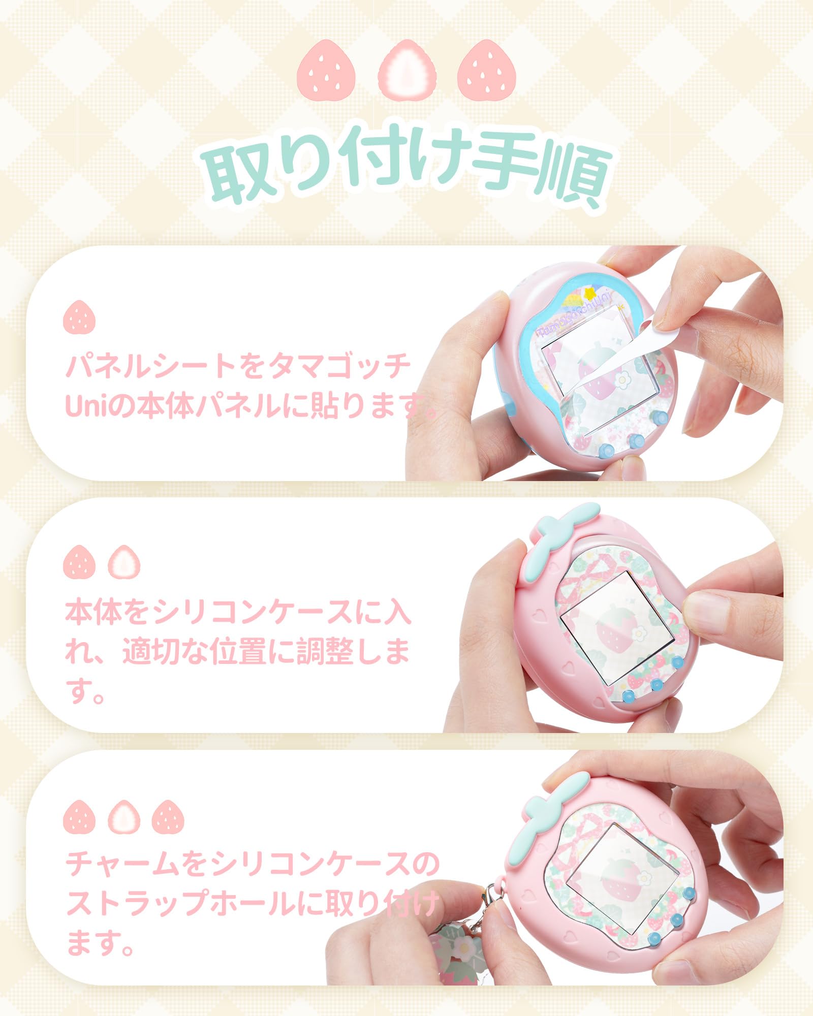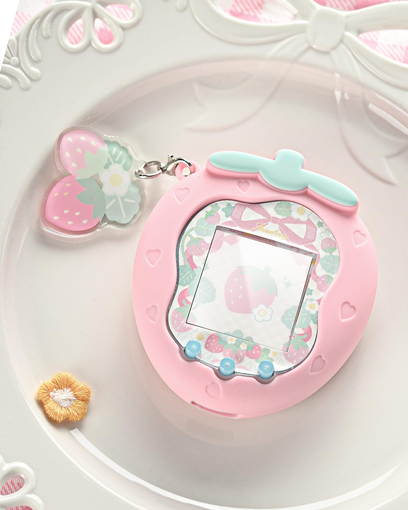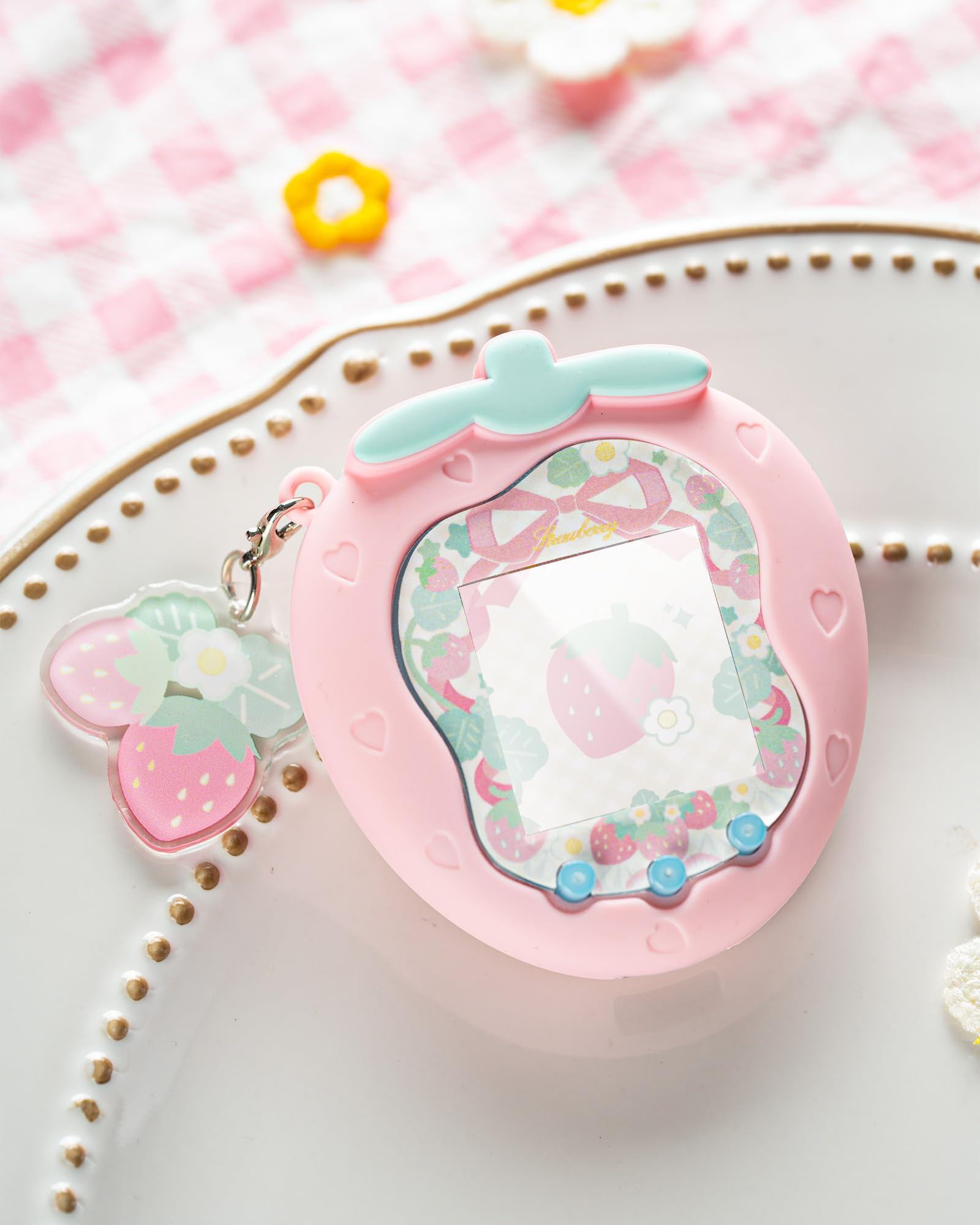 GeekShare For Tamagotchi Uniケース タマゴッチ Uni専用ケースシリコン 保護カバー 衝撃保護 指紋防止 防汚防水 ギス防止 装着充電可能 おしゃれなチャームとスティッカー付き-ピンクイチゴ