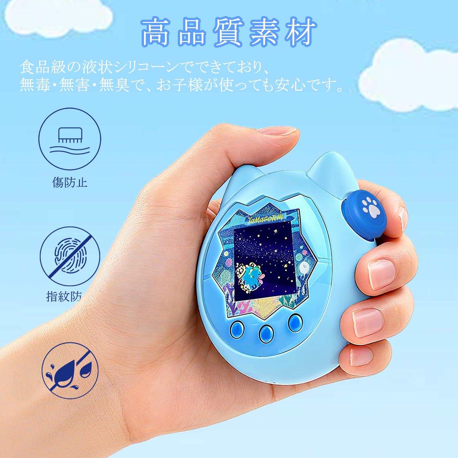For Tamagotchi Paradise(たまごっちパラダイス) 専用ケース【Srelirly】3倍高反発 保護カバー 耐衝撃 落下防止 防塵防汚 防水 指紋防止 食品級安全 可愛い猫型 全面保護ケース 紛失防止ストラップ付き (あお BLUE/ダイヤルカバー)