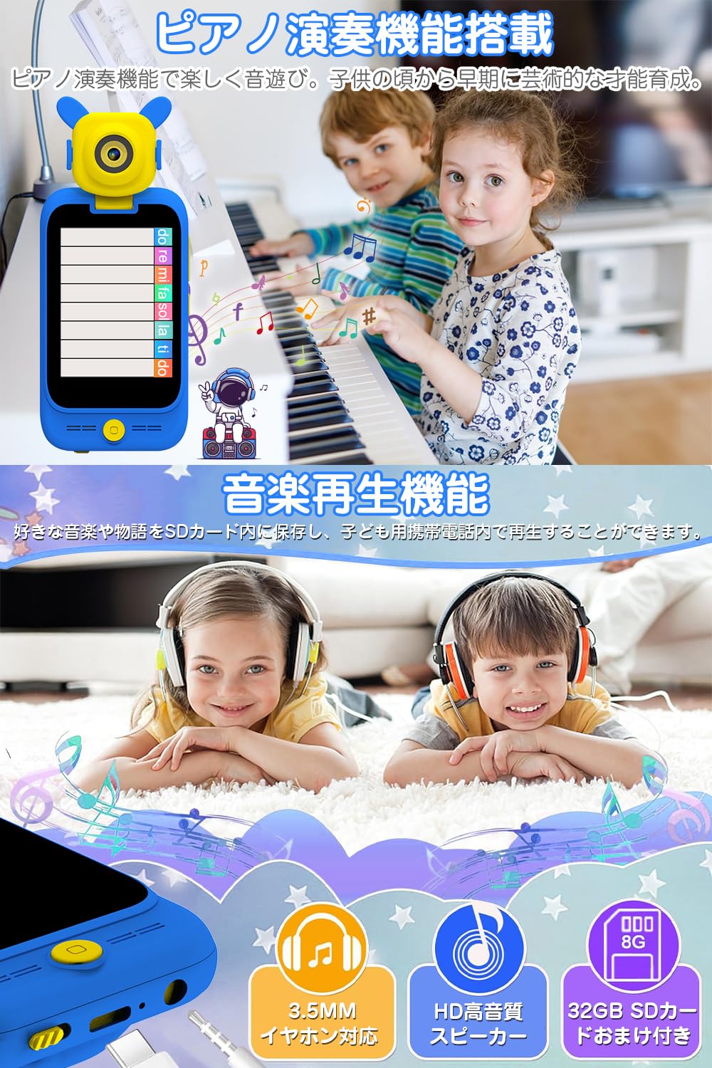* 【MP3ミュージックフォン】MP3ミュージック機能搭載のキッズ向けスマートフォン。 子供たちは、好きな時に好きな音楽を保存・再生し、キッズカメラで自由な時間に音楽を楽しむことができます。 幼い頃から音楽に影響を受け、音楽の才能の無限の可能性を引き出せるのです パソコンに接続した充電ケーブルで携帯電話に曲をダウンロードし、「My Music」フォルダを探せば、お子様のお気に入りの曲や童話の音声を転送することができます。 【時間管理】 起きる時間や昼寝の時間などを設定することで、自分で時間管理する力を身につけることができます。※注意:下側のボタンを「ON」に移動すると、正常にオンと充電ができます。