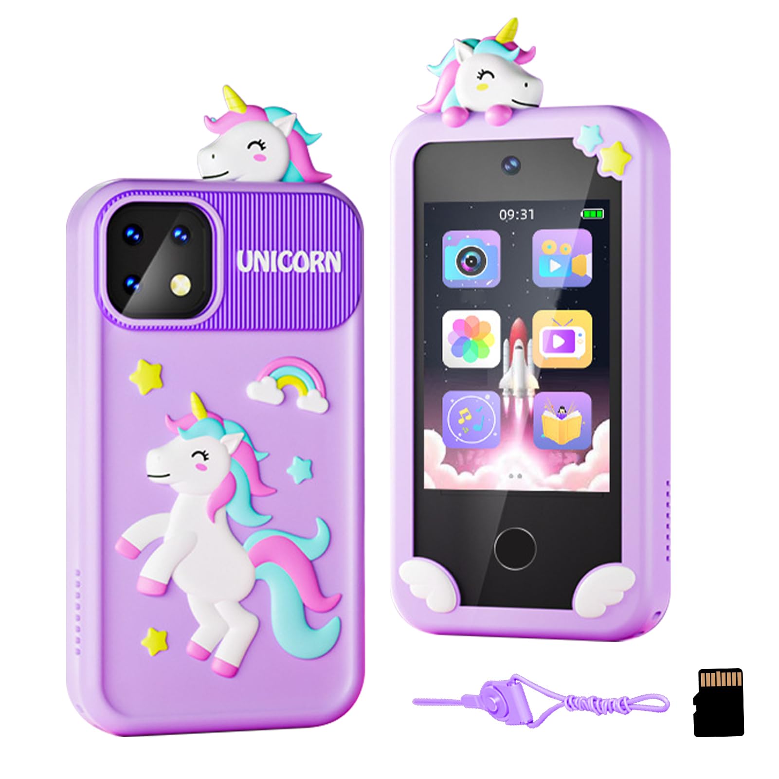 キッズスマホ おもちゃ 子供用 子ども スマホ スマートフォン 前後カメラ 自撮り 知育 英語学習 ユニコーン 恐竜 メモリーカード シリコンカバー ストラップ付 (パープル, ユニコーン)