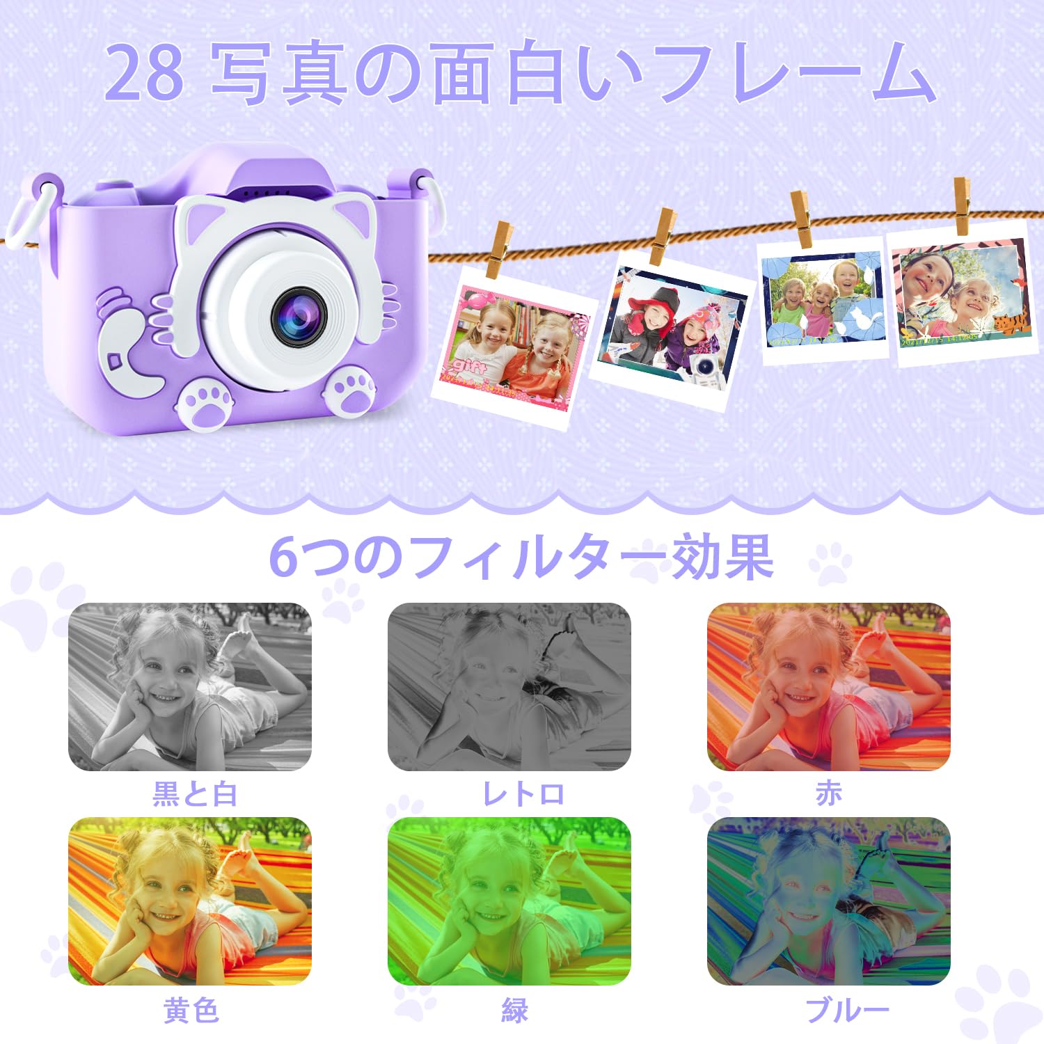 * 【複数の機能、小さな手のひらを使って大きな楽しみで遊ぶ】子供用カメラには、28の漫画のステッカーフォトフレームと6つのフィルターがあります。同時に自撮り、動画、再生、録画、パズルゲームなどの機能も搭載。キッズカメラには、前面と背面の両方に HD レンズがあり、HD IPS 目の保護スクリーンがあり、お子様の視力を損なうことを防ぎます。お子様は子供時代の軌跡を記録し、思い出に残る瞬間を捉えることができます。