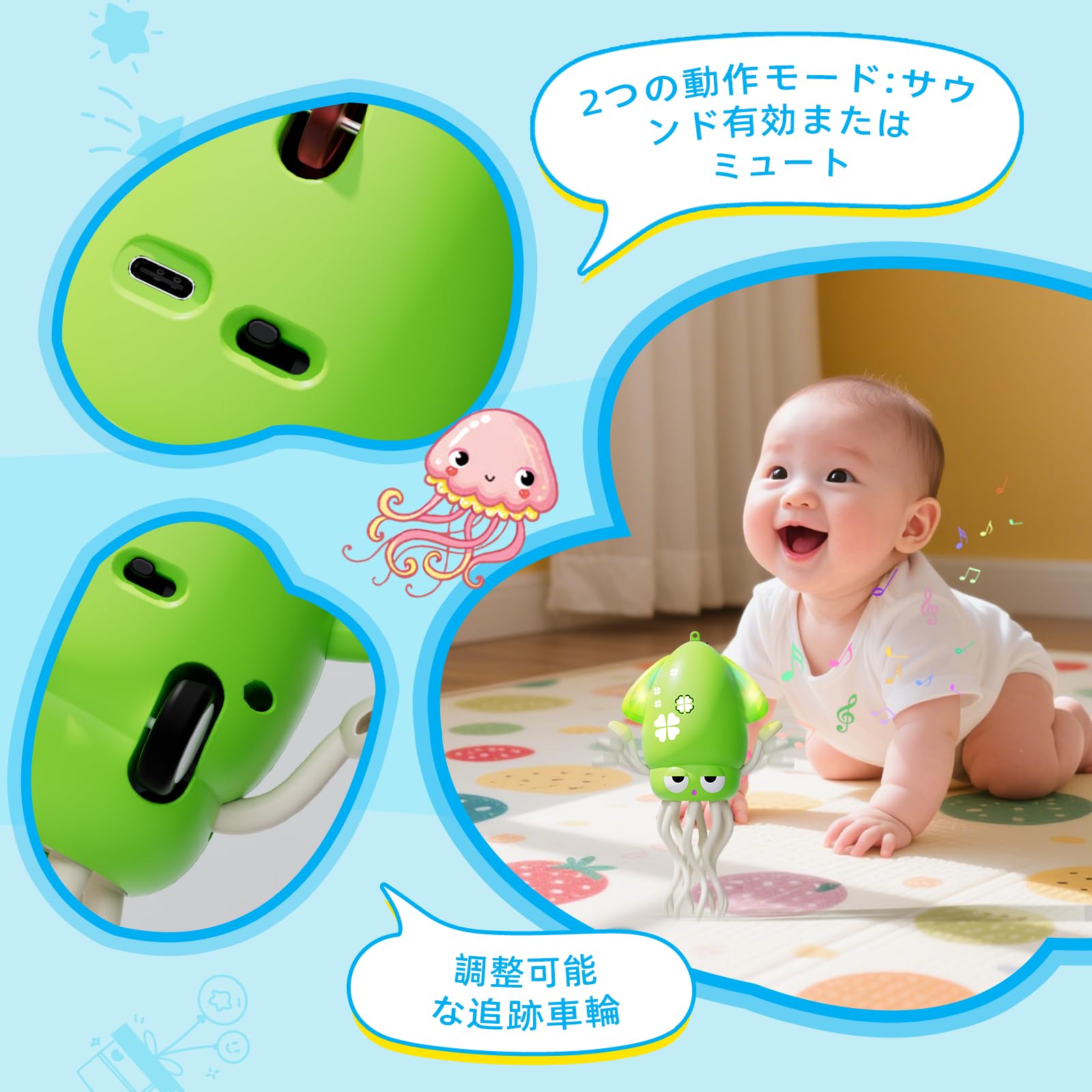 動くタコ型ロボットおもちゃ ダンシング イカ おもちゃ 動く 電動 踊るタコ 障害物自動回避 LEDライト&音楽付き 釣りごっこ遊び Type-C充電 知育玩具 クリスマス 誕生日 プレゼント ギフト (グリーン)