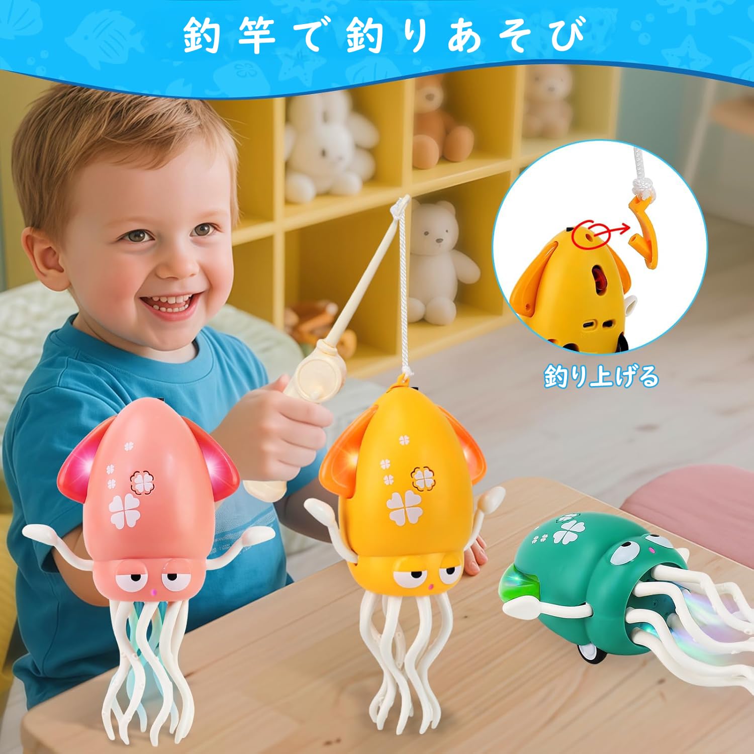 * 【3つの遊び方】当踊るタコおもちゃは、立たせてダンスを楽しんだり、床に寝かせてハイハイする様子を眺めたり、釣竿で吊り上げて移動中にくるくる回るのを見たりと、3通りの遊び方が楽しめます。