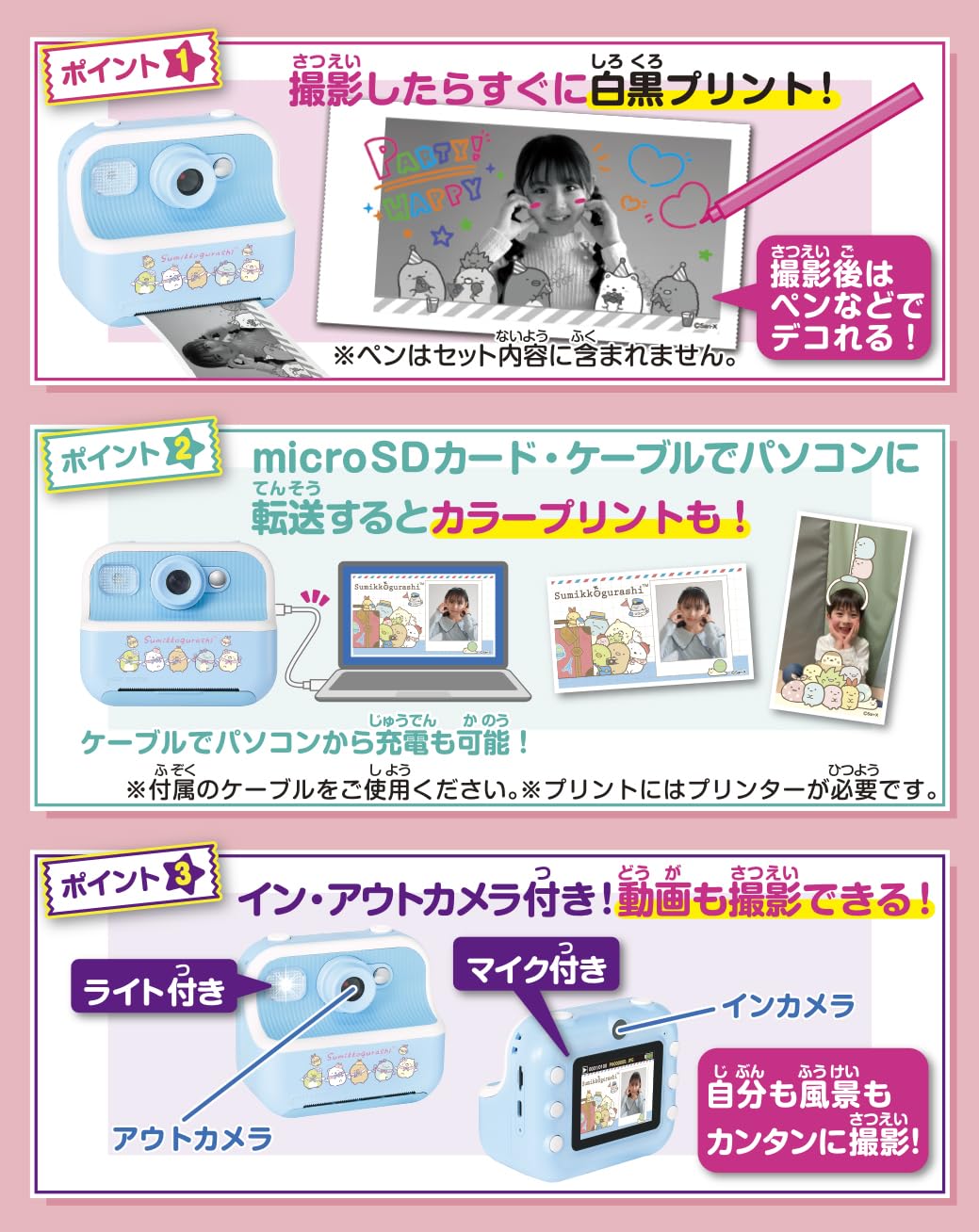 * すみっコの可愛いフレーム付きで撮影でき、撮影後すぐに白黒写真が印刷されて出てくるカメラです。