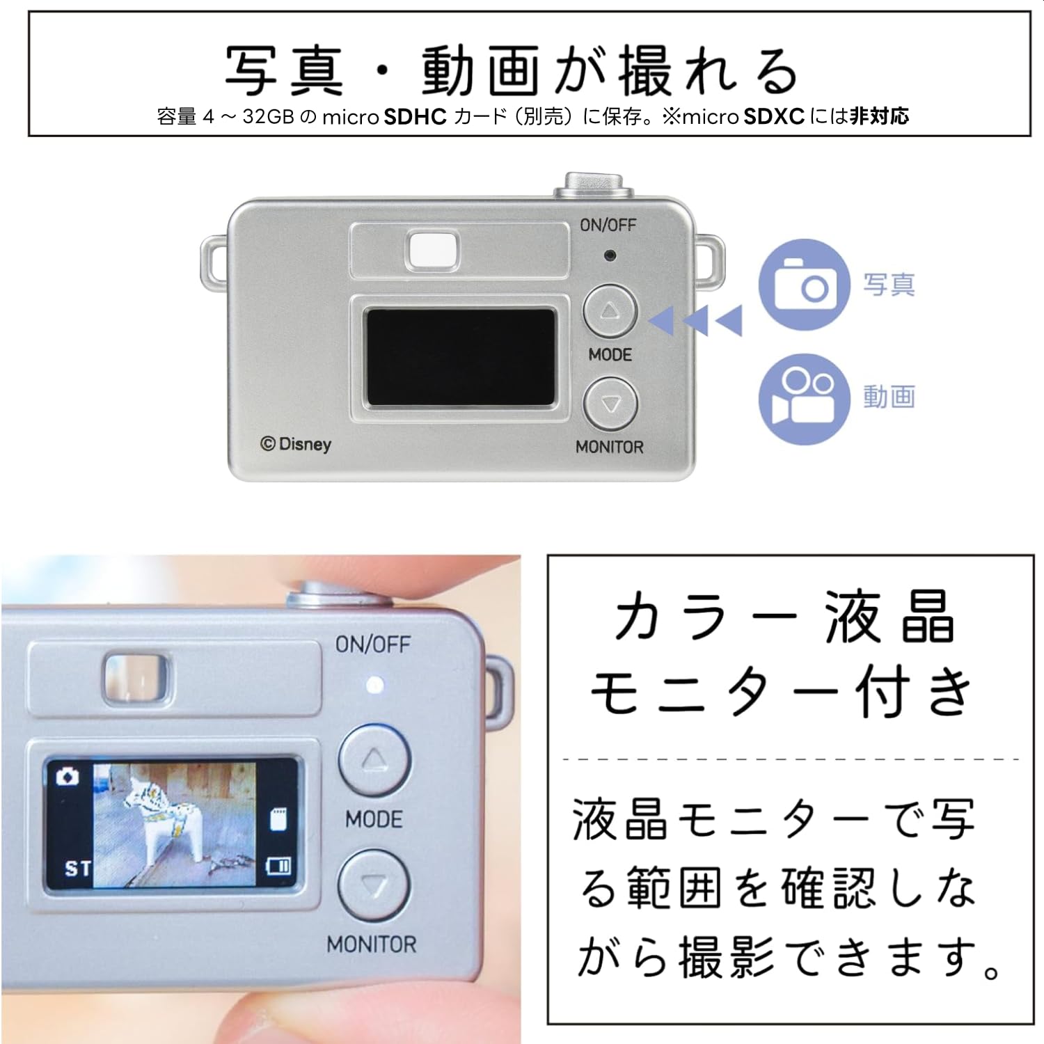 * 【ディズニーキャラクターがトイカメラになった!】ディズニーキャラクターを前面にあしらった、小型クラシックカメラ風トイカメラです。キーチェーンのように小さいのに写真と音声付き動画を撮ることができます。 Disney DISNEY.