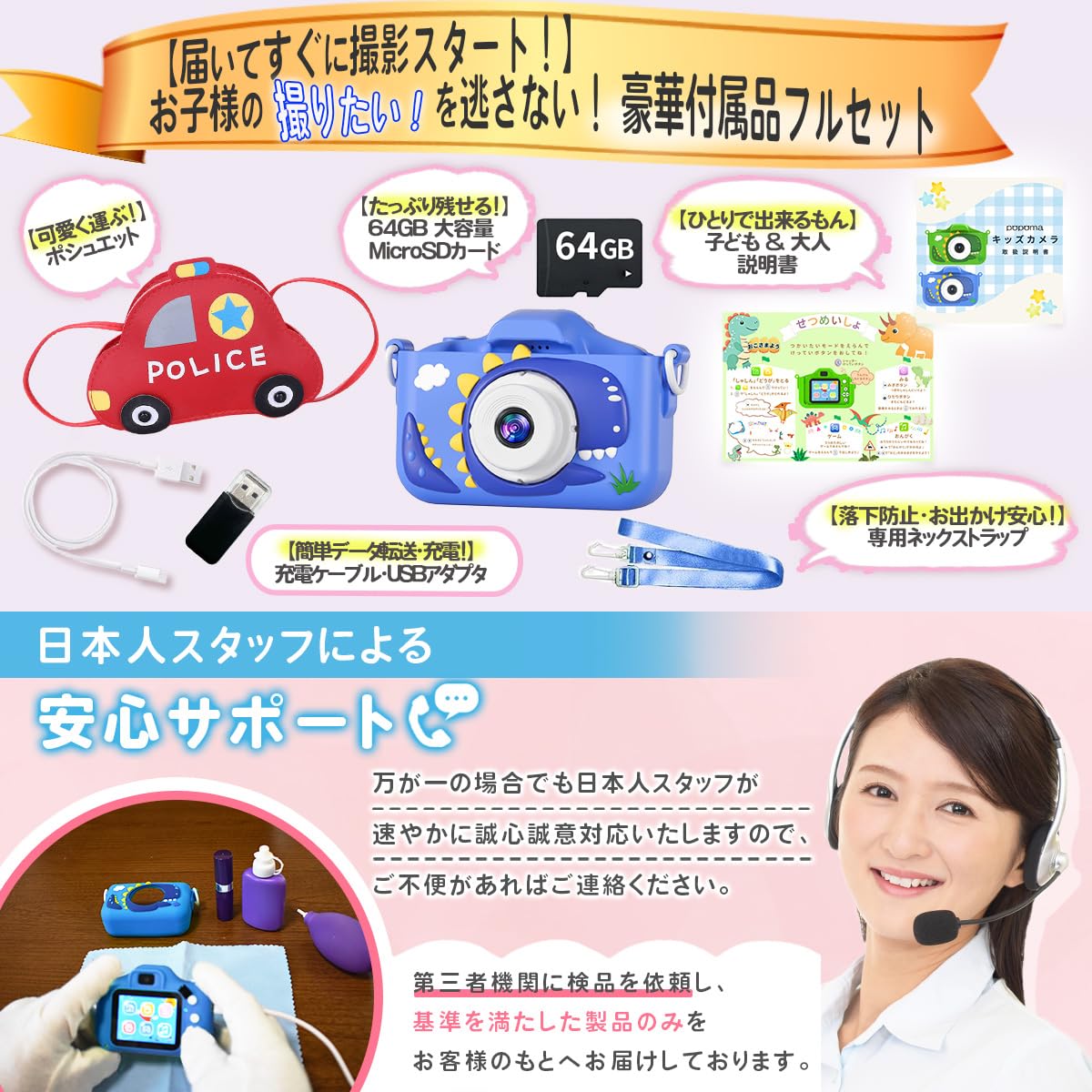 【誕生日メッセージカード&ラッピング対応】 【パトカーポシェット付 64GB】恐竜 キッズカメラ トイ 子供用 国内サポート 4800万画素 1080P HD 日本語説明書 ゲーム機能 男の子 誕生日 プレゼント 青 レッド popoma