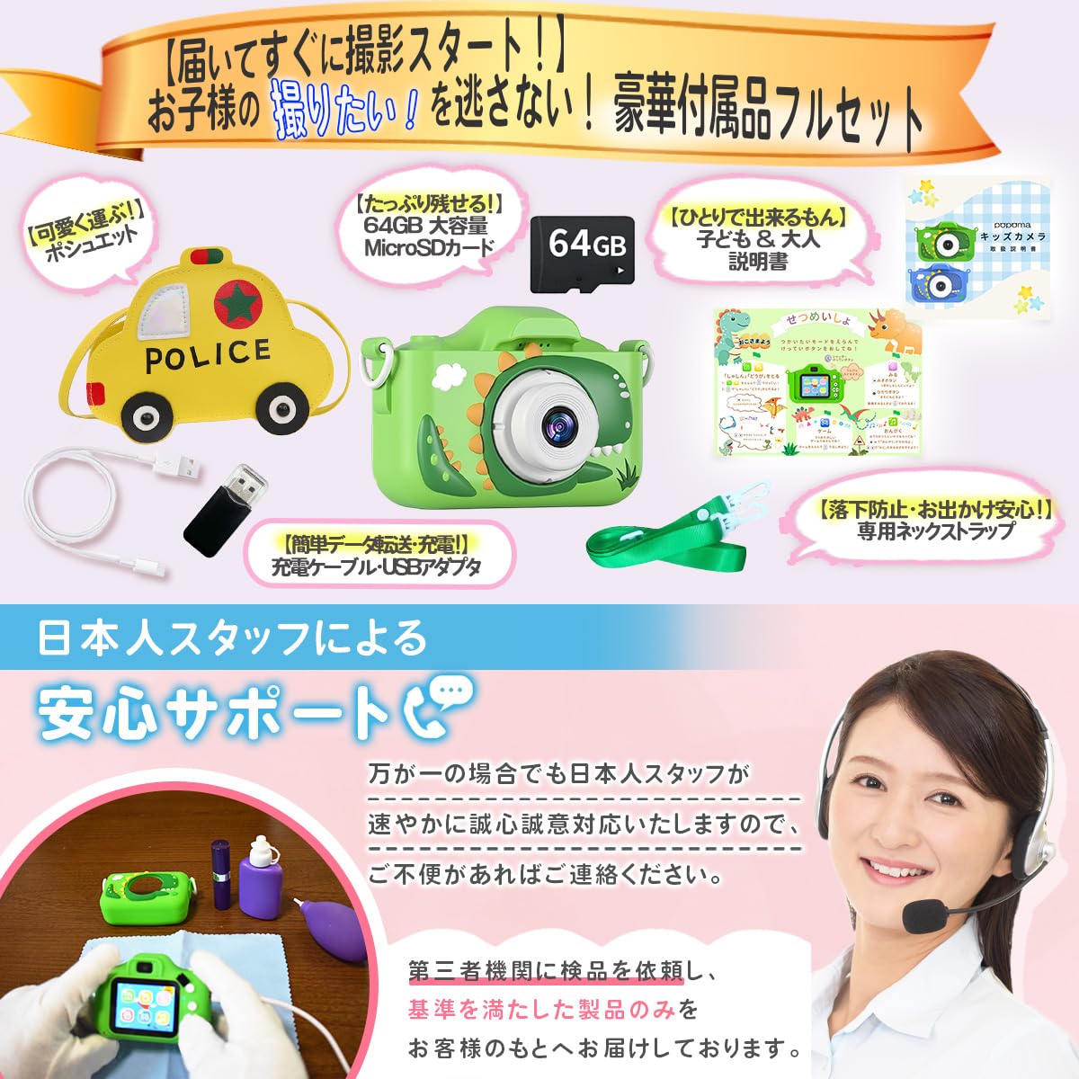 【ラッピング対応】 【パトカーポシェット付 64GB】恐竜 キッズカメラ トイ 子供用 国内サポート 4800万画素 1080P HD 日本語説明書 ゲーム機能 男の子 誕生日 プレゼント 緑 イエロー popoma