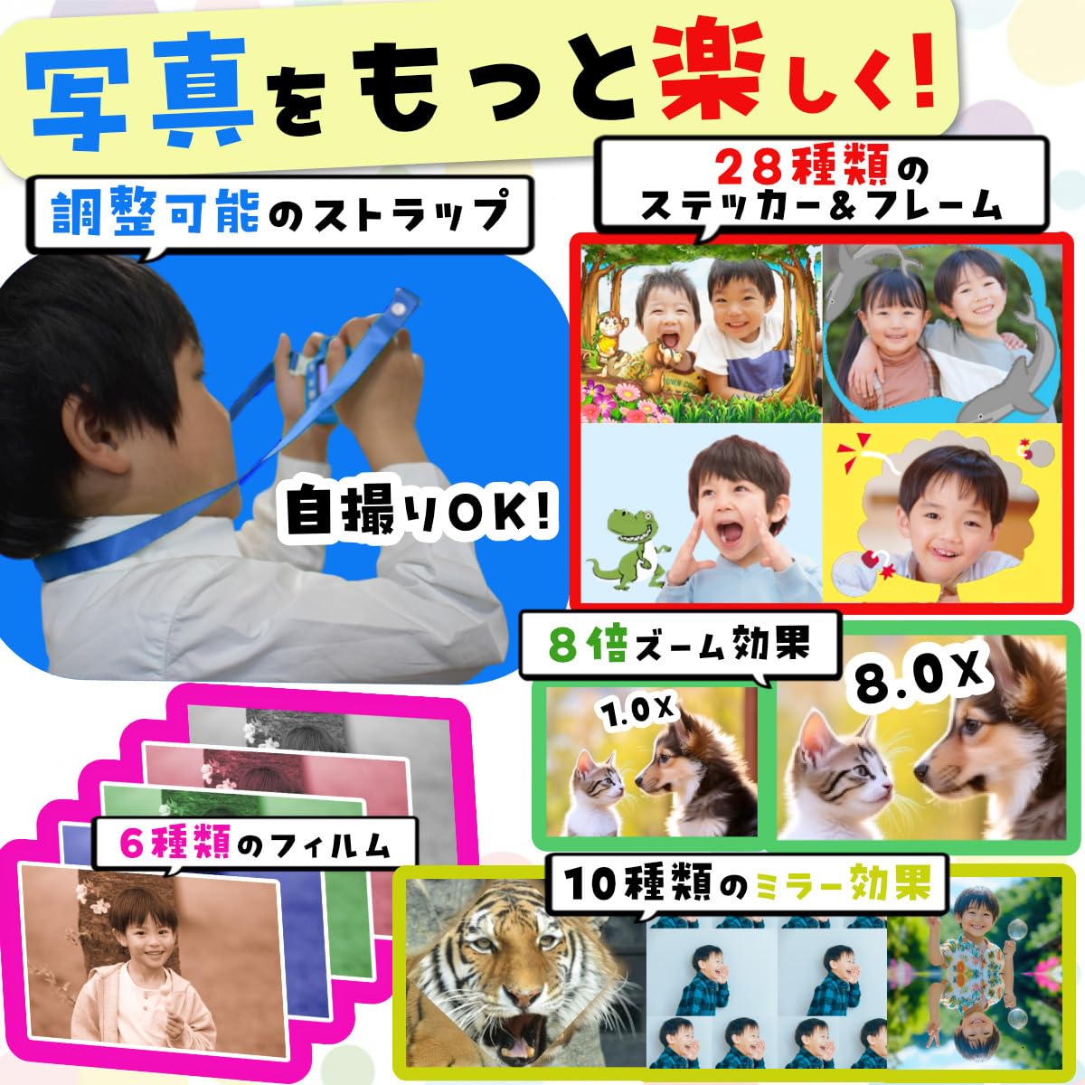 * 【多機能トイカメラ】 44種類のフレームやフィルター、ミラー効果が楽しめ、スローモーションやタイマー撮影機能も搭載。2.0インチの大きなスクリーンと前後カメラにより、簡単に自撮りや動画撮影ができます。さらに、ゲームや音楽プレーヤーとしても遊べる機能があるので、子どもにとって飽きることのないカメラです。コンパクトなサイズ感で、子供の小さな手でも扱いやすい設計です。