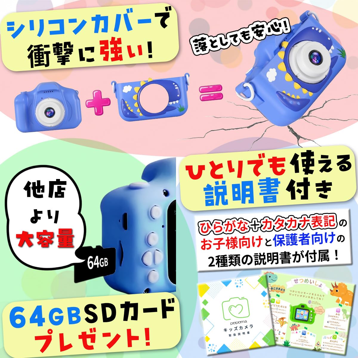 【ラッピング対応】 【パトカーポシェット付 64GB】恐竜 キッズカメラ トイ 子供用 国内サポート 4800万画素 1080P HD 日本語説明書 ゲーム機能 男の子 誕生日 プレゼント 青 レッド popoma