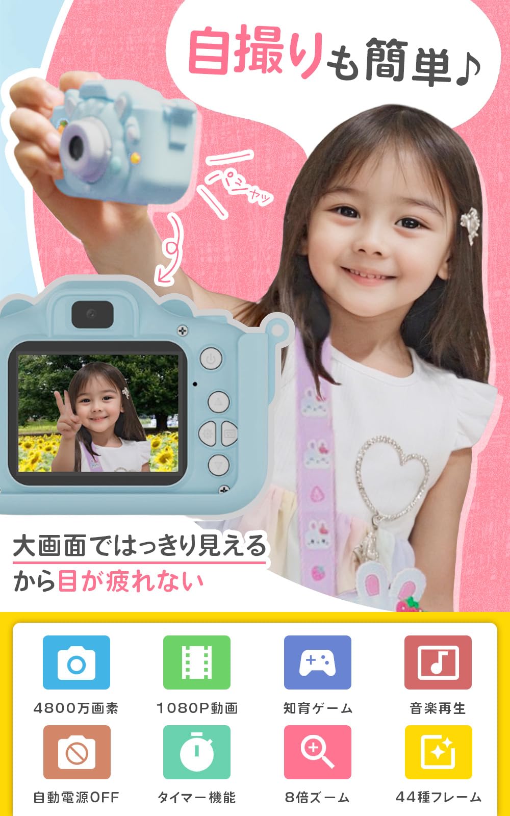 * 【多機能トイカメラ】44種類のフレームやフィルター、ミラー効果が楽しめ、スローモーションやタイマー撮影機能も搭載。2.0インチの大きなスクリーンと前後カメラにより、簡単に自撮りや動画撮影ができます。さらに、ゲームや音楽プレーヤーとしても遊べる機能があるので、子どもにとって飽きることのないカメラです。コンパクトなサイズ感で、子供の小さな手でも扱いやすい設計です。