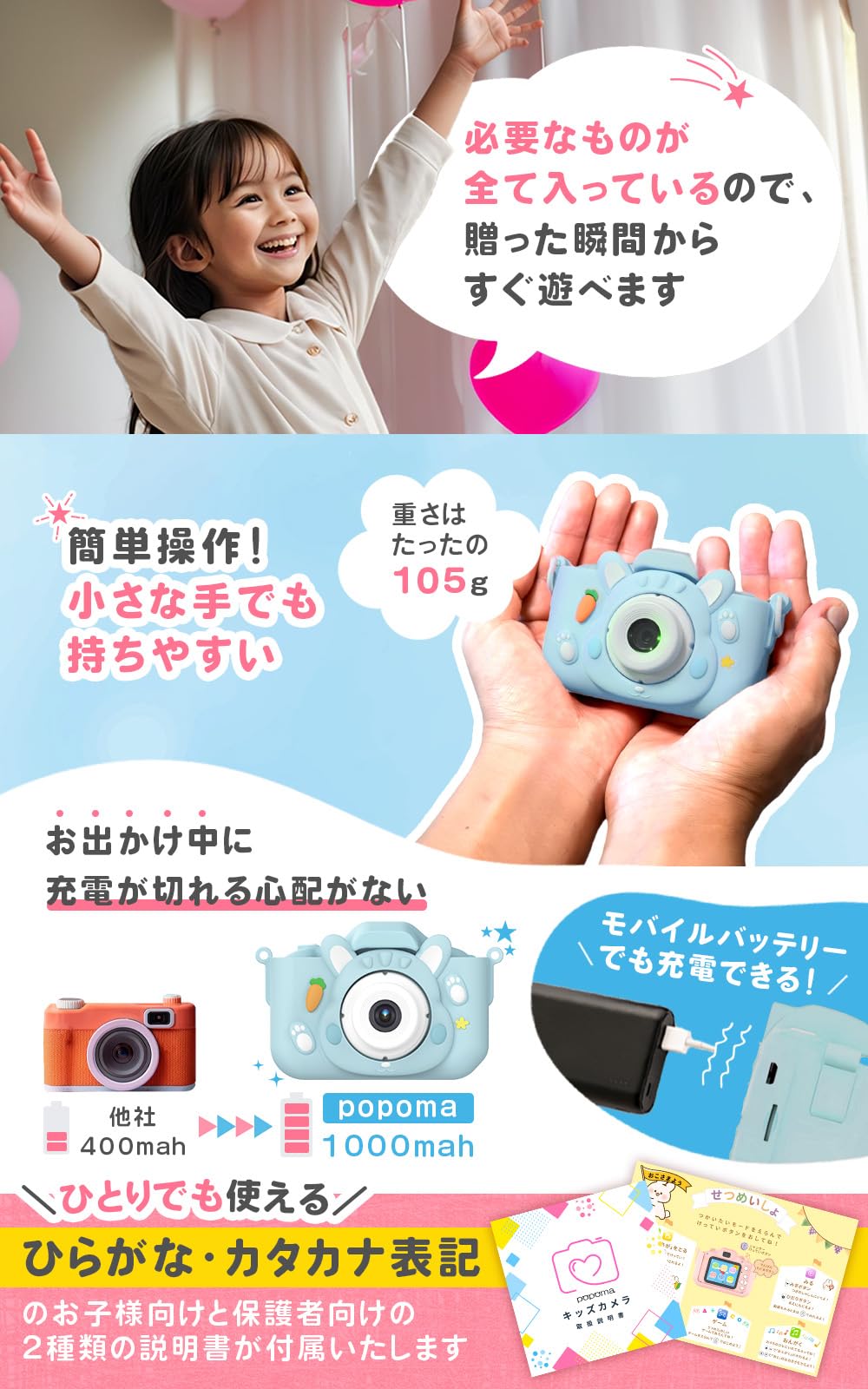 * 【popomaキッズカメラのおすすめポイント】キッズカメラには、かわいいウサギのポーチがセットになっています。柔らかい素材で触り心地が良く、キッズカメラを持ち運ぶのにもぴったりです。子供用・大人用の2種類の説明書があり、子供でも使い方がすぐに理解できる工夫がされています。