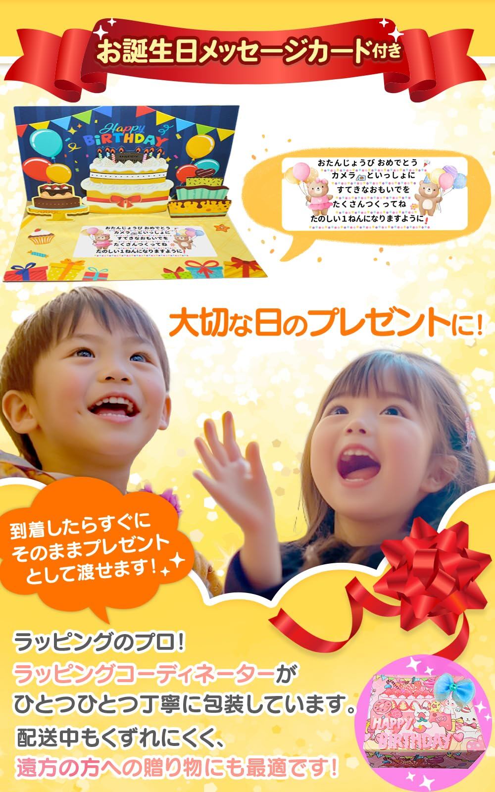 * 愛らしいウサギ柄の丁寧なラッピングと、飛び出すメッセージカードで、誕生日のサプライズ演出をサポート。お子さまに「わあ!」と声が出るような驚きと喜びを贈れます。カメラはすぐに使える状態でお届けするため、開けたその瞬間から楽しい時間が始まります。日本企業販売ならではのあんしんの国内サービス体制で、記念日を特別な思い出にしたい方に大人気の女の子・男の子への贈り物です。